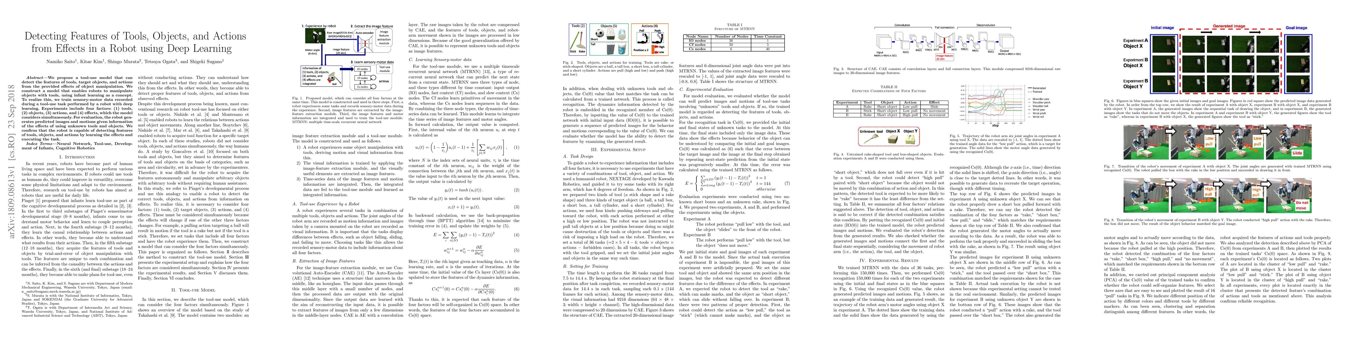 This paper proposes a deep learning model to detect features of tools, objects, and actions from the effects of manipulation in a robot. The model, inspired by infant learning, trains on sensory-motor data from tool-use tasks and successfully predicts images and motions for unknown tools and objects.
