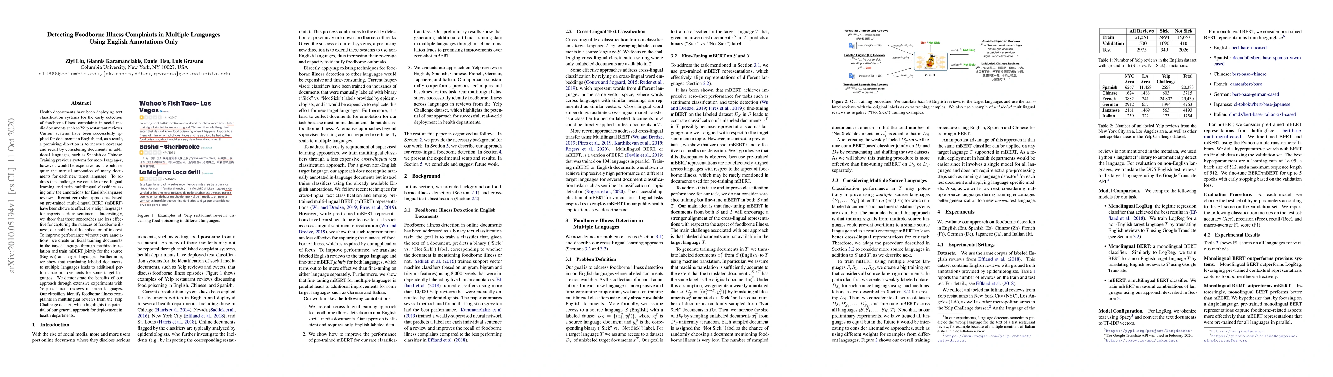This paper explores the use of pre-trained multilingual BERT models to detect foodborne illness complaints in social media reviews across multiple languages, leveraging only English annotations. The authors propose a method that generates artificial training data through machine translation and jointly trains the model to improve performance without additional annotations, demonstrating effectiveness across seven languages.