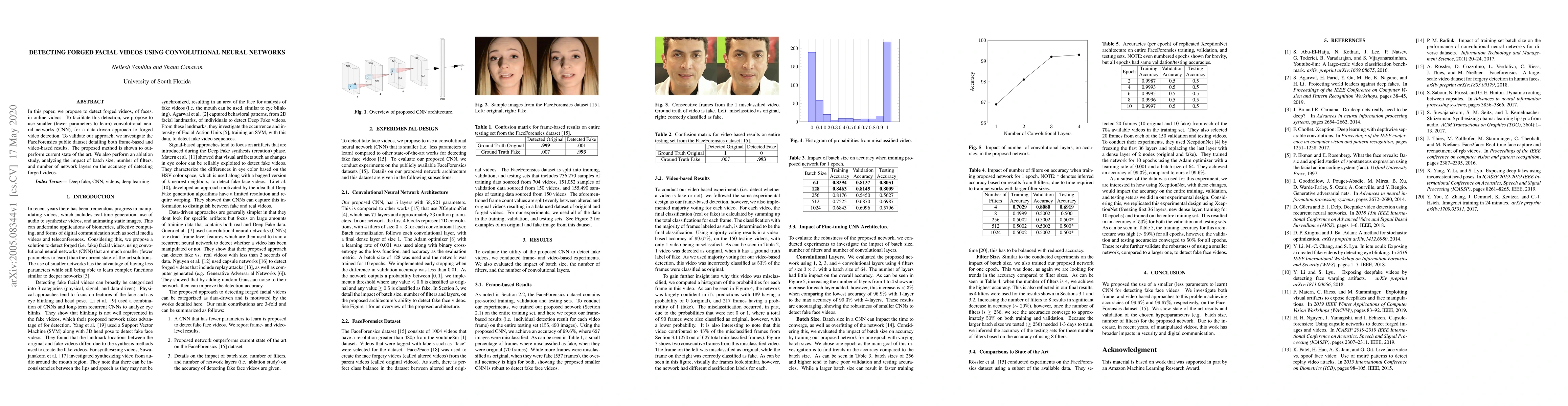 This paper proposes a convolutional neural network (CNN) for detecting forged facial videos in online content, utilizing a smaller CNN to enhance efficiency. The method is validated using the FaceForensics dataset, demonstrating superior performance over existing techniques, and an ablation study assesses the influence of various network parameters on detection accuracy.