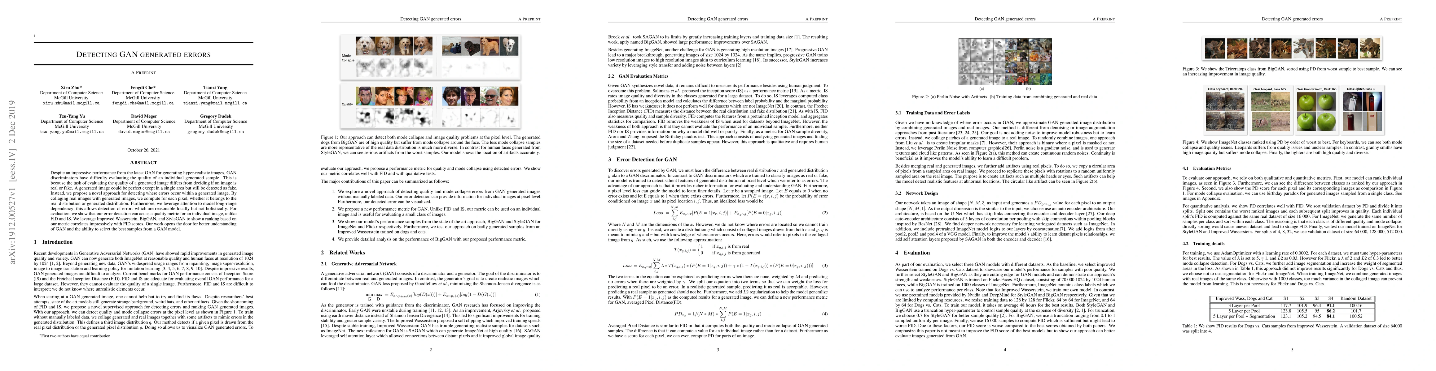 Despite an impressive performance from the latest GAN for generating hyper-realistic images, GAN discriminators have difficulty evaluating the quality of an individual generated sample. This is because the task of evaluating the quality of a generated image differs from deciding if an image is real or fake. A generated image could be perfect except in a single area but still be detected as fake. Instead, we propose a novel approach for detecting where errors occur within a generated image. By collaging real images with generated images, we compute for each pixel, whether it belongs to the real distribution or generated distribution. Furthermore, we leverage attention to model long-range dependency; this allows detection of errors which are reasonable locally but not holistically. For evaluation, we show that our error detection can act as a quality metric for an individual image, unlike FID and IS. We leverage Improved Wasserstein, BigGAN, and StyleGAN to show a ranking based on our metric correlates impressively with FID scores. Our work opens the door for better understanding of GAN and the ability to select the best samples from a GAN model.