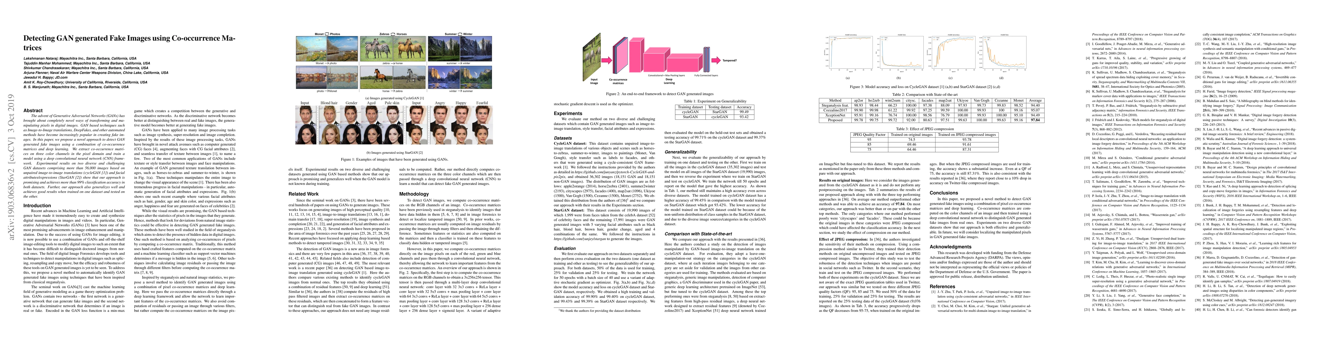This paper proposes a novel method to detect GAN-generated fake images using co-occurrence matrices combined with deep learning. The approach achieves over 99% classification accuracy on two diverse GAN datasets, demonstrating strong generalization across different GAN models.