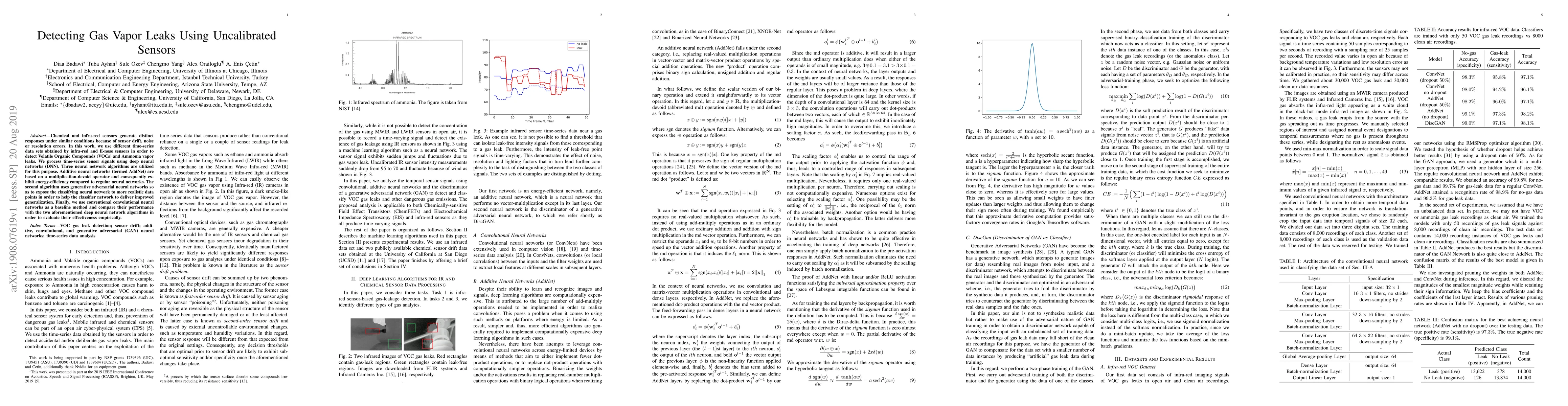 Chemical and infra-red sensors generate distinct responses under similar conditions because of sensor drift, noise or resolution errors. In this work, we use different time-series data sets obtained by infra-red and E-nose sensors in order to detect Volatile Organic Compounds (VOCs) and Ammonia vapor leaks. We process time-series sensor signals using deep neural networks (DNN). Three neural network algorithms are utilized for this purpose. Additive neural networks (termed AddNet) are based on a multiplication-devoid operator and consequently exhibit energy-efficiency compared to regular neural networks. The second algorithm uses generative adversarial neural networks so as to expose the classifying neural network to more realistic data points in order to help the classifier network to deliver improved generalization. Finally, we use conventional convolutional neural networks as a baseline method and compare their performance with the two aforementioned deep neural network algorithms in order to evaluate their effectiveness empirically.