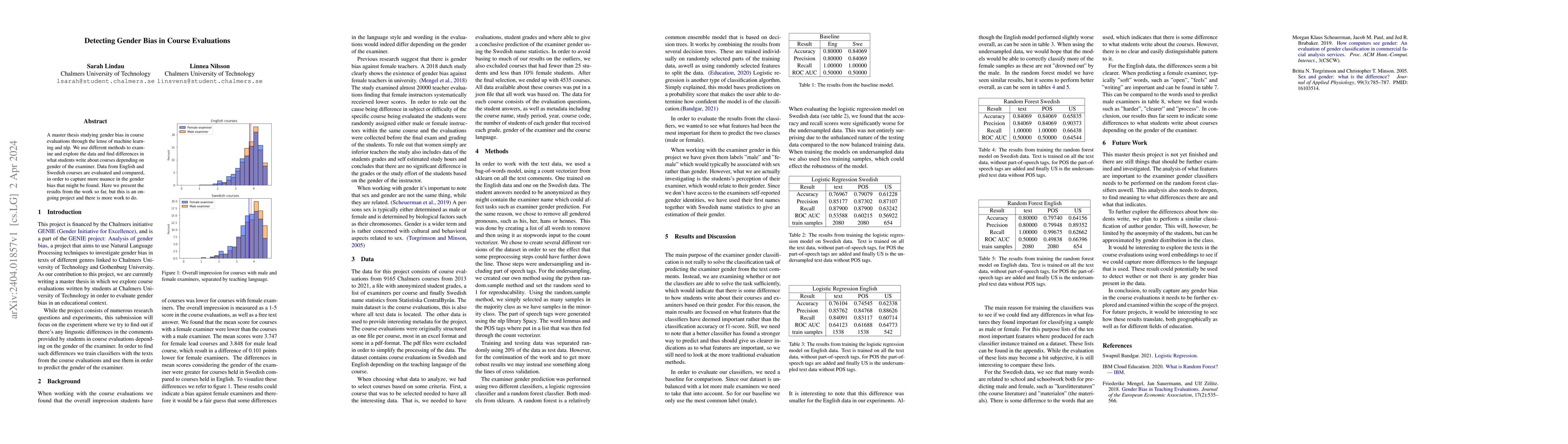 An outtake from the findnings of a master thesis studying gender bias in course evaluations through the lense of machine learning and nlp. We use different methods to examine and explore the data and find differences in what students write about courses depending on gender of the examiner. Data from English and Swedish courses are evaluated and compared, in order to capture more nuance in the gender bias that might be found. Here we present the results from the work so far, but this is an ongoing project and there is more work to do.