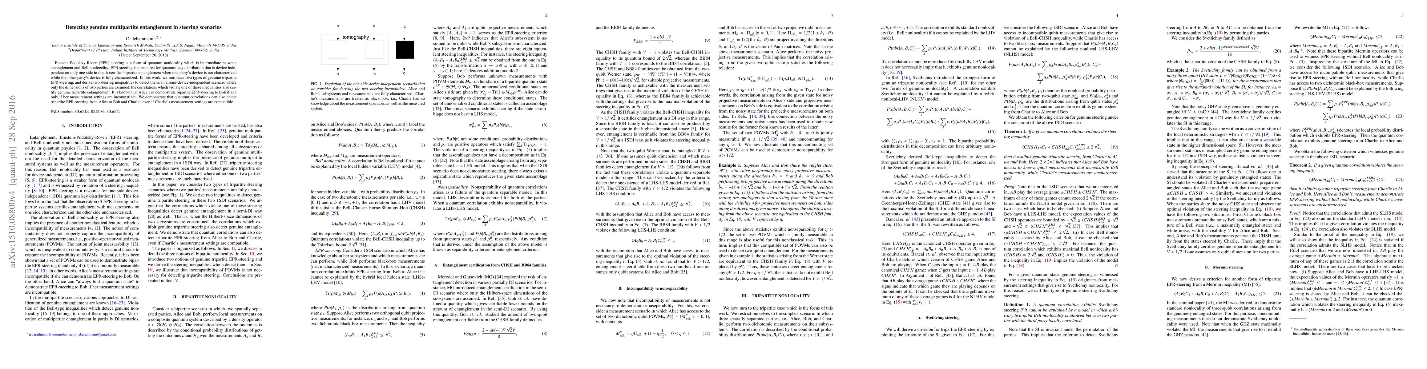 Einstein-Podolsky-Rosen (EPR) steering is a form of quantum nonlocality which is intermediate between entanglement and Bell nonlocality. EPR steering is a resource for quantum key distribution that is device independent on only one side in that it certifies bipartite entanglement when one party's device is not characterized while the other party's device is fully characterized. In this work, we introduce two types of genuine tripartite EPR-steering, and derive two steering inequalities to detect them. In a semi-device-independent scenario where only the dimensions of two parties are assumed, the correlations which violate one of these inequalities also certify genuine tripartite entanglement. It is known that Alice can demonstrate bipartite EPR-steering to Bob if and only if her measurement settings are incompatible. We demonstrate that quantum correlations can also detect tripartite EPR-steering from Alice to Bob and Charlie, even if Charlie's measurement settings are compatible.