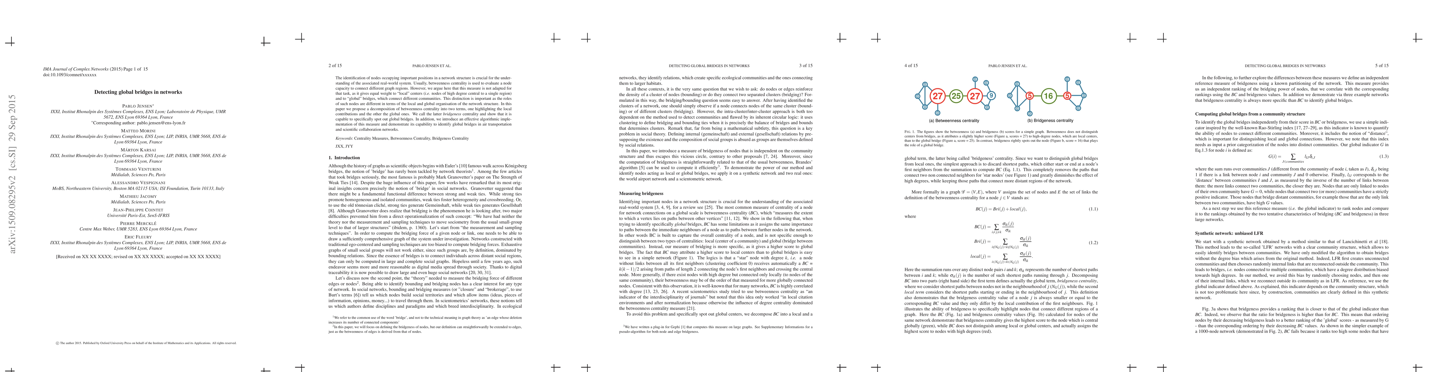 The identification of nodes occupying important positions in a network structure is crucial for the understanding of the associated real-world system. Usually, betweenness centrality is used to evaluate a node capacity to connect different graph regions. However, we argue here that this measure is not adapted for that task, as it gives equal weight to "local" centers (i.e. nodes of high degree central to a single region) and to "global" bridges, which connect different communities. This distinction is important as the roles of such nodes are different in terms of the local and global organisation of the network structure. In this paper we propose a decomposition of betweenness centrality into two terms, one highlighting the local contributions and the other the global ones. We call the latter bridgeness centrality and show that it is capable to specifically spot out global bridges. In addition, we introduce an effective algorithmic implementation of this measure and demonstrate its capability to identify global bridges in air transportation and scientific collaboration networks.
