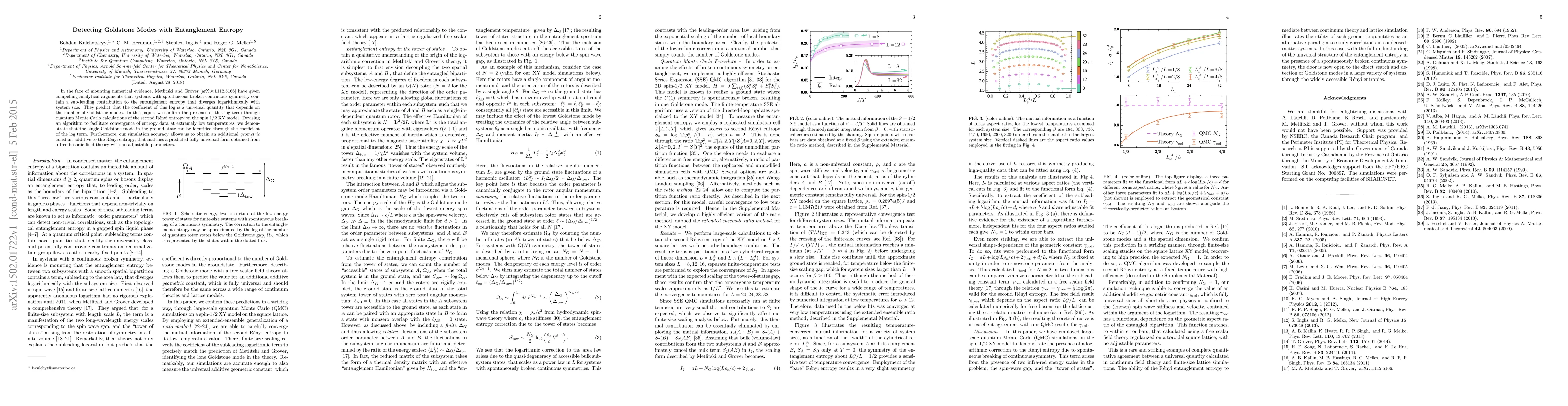 In the face of mounting numerical evidence, Metlitski and Grover [arXiv:1112.5166] have given compelling analytical arguments that systems with spontaneous broken continuous symmetry contain a sub-leading contribution to the entanglement entropy that diverges logarithmically with system size. They predict that the coefficient of this log is a universal quantity that depends on the number of Goldstone modes. In this paper, we confirm the presence of this log term through quantum Monte Carlo calculations of the second R\'enyi entropy on the spin 1/2 XY model. Devising an algorithm to facilitate convergence of entropy data at extremely low temperatures, we demonstrate that the single Goldstone mode in the ground state can be identified through the coefficient of the log term. Furthermore, our simulation accuracy allows us to obtain an additional geometric constant additive to the R\'enyi entropy, that matches a predicted fully-universal form obtained from a free bosonic field theory with no adjustable parameters.