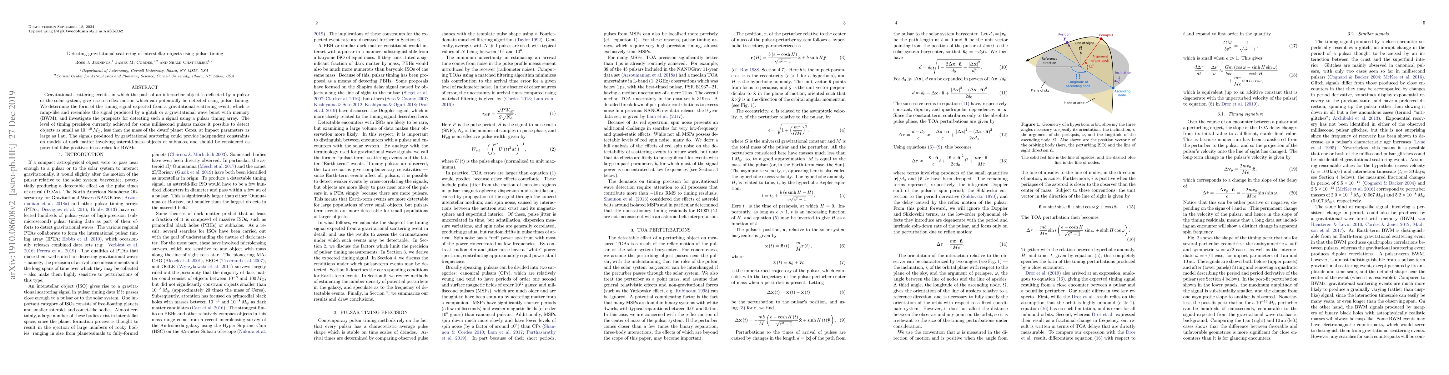 This paper explores the detection of gravitational scattering of interstellar objects via pulsar timing, identifying a ramp-like signal that could be mistaken for glitches or gravitational wave bursts. It concludes that current pulsar timing precision can detect objects as small as $10^{-10}$ solar masses, potentially offering insights into dark matter models and serving as a cautionary signal in gravitational wave searches.