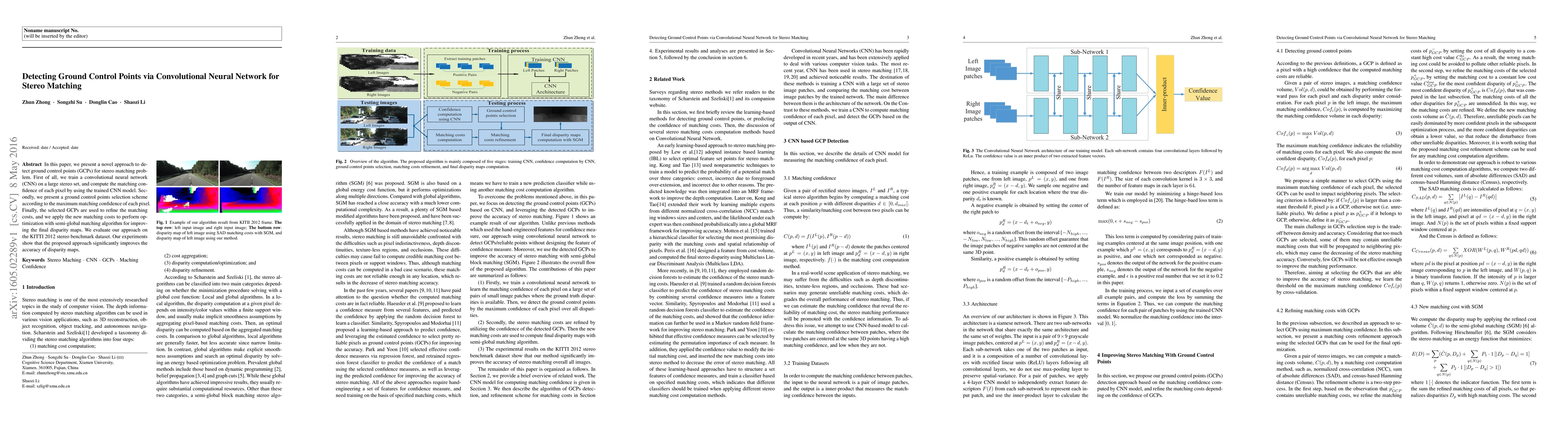 This paper introduces a CNN-based method for detecting ground control points (GCPs) in stereo matching, enhancing disparity map accuracy. The approach trains a CNN on a large stereo dataset, selects GCPs based on maximum matching confidence, and refines matching costs for improved disparity maps using semi-global matching optimization.