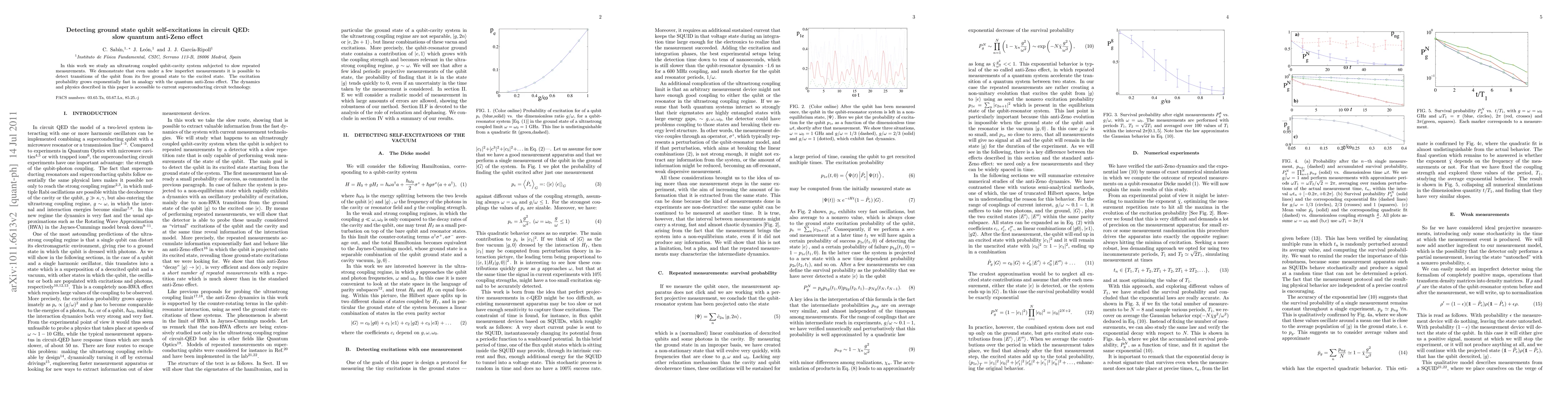 In this work we study an ultrastrong coupled qubit-cavity system subjected to slow repeated measurements. We demonstrate that even under a few imperfect measurements it is possible to detect transitions of the qubit from its free ground state to the excited state. The excitation probability grows exponentially fast in analogy with the quantum anti-Zeno effect. The dynamics and physics described in this paper is accessible to current superconducting circuit technology.