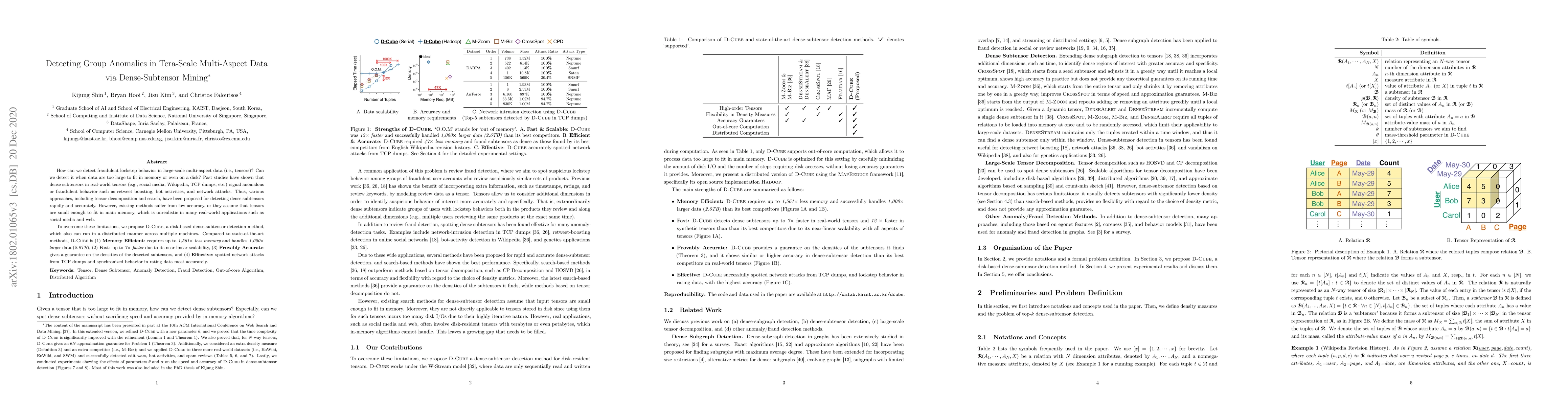 How can we detect fraudulent lockstep behavior in large-scale multi-aspect data (i.e., tensors)? Can we detect it when data are too large to fit in memory or even on a disk? Past studies have shown that dense subtensors in real-world tensors (e.g., social media, Wikipedia, TCP dumps, etc.) signal anomalous or fraudulent behavior such as retweet boosting, bot activities, and network attacks. Thus, various approaches, including tensor decomposition and search, have been proposed for detecting dense subtensors rapidly and accurately. However, existing methods have low accuracy, or they assume that tensors are small enough to fit in main memory, which is unrealistic in many real-world applications such as social media and web. To overcome these limitations, we propose D-CUBE, a disk-based dense-subtensor detection method, which also can run in a distributed manner across multiple machines. Compared to state-of-the-art methods, D-CUBE is (1) Memory Efficient: requires up to 1,561X less memory and handles 1,000X larger data (2.6TB), (2) Fast: up to 7X faster due to its near-linear scalability, (3) Provably Accurate: gives a guarantee on the densities of the detected subtensors, and (4) Effective: spotted network attacks from TCP dumps and synchronized behavior in rating data most accurately.
