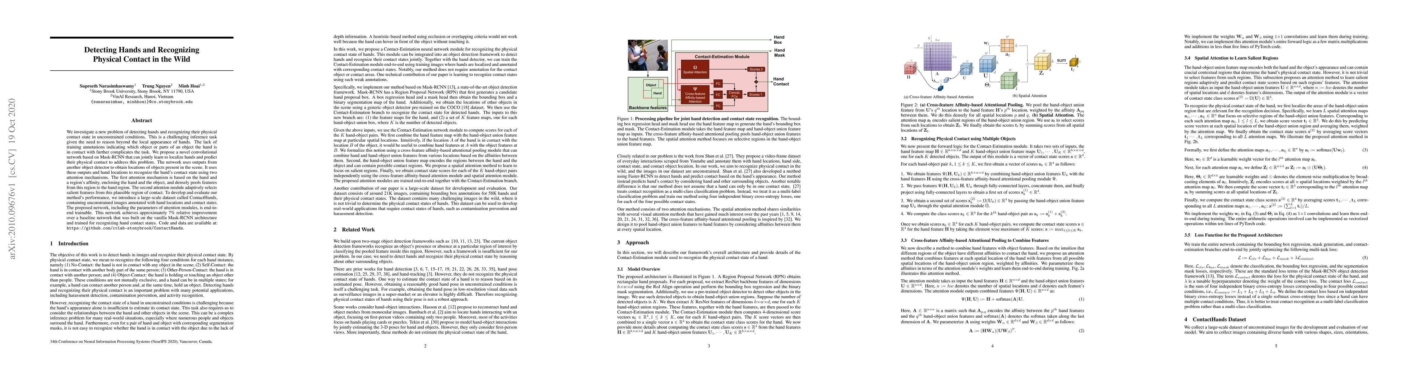 Researchers developed a novel convolutional network to detect hands and recognize physical contact in the wild, achieving a 7% relative improvement over a baseline model using a large-scale dataset called ContactHands.
