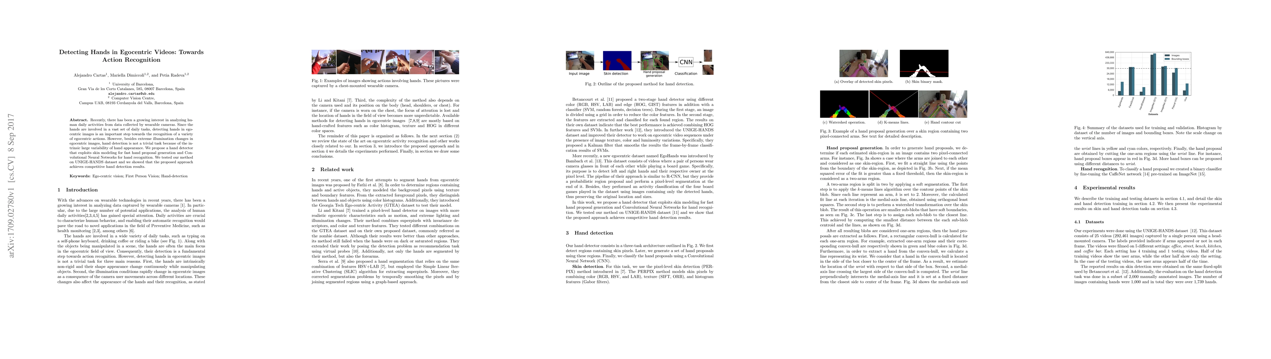 This paper proposes a method for detecting hands in egocentric videos to aid in action recognition, using skin modeling and Convolutional Neural Networks. The approach was tested on the UNIGE-HANDS dataset, demonstrating competitive results despite challenges from variability and illumination changes.