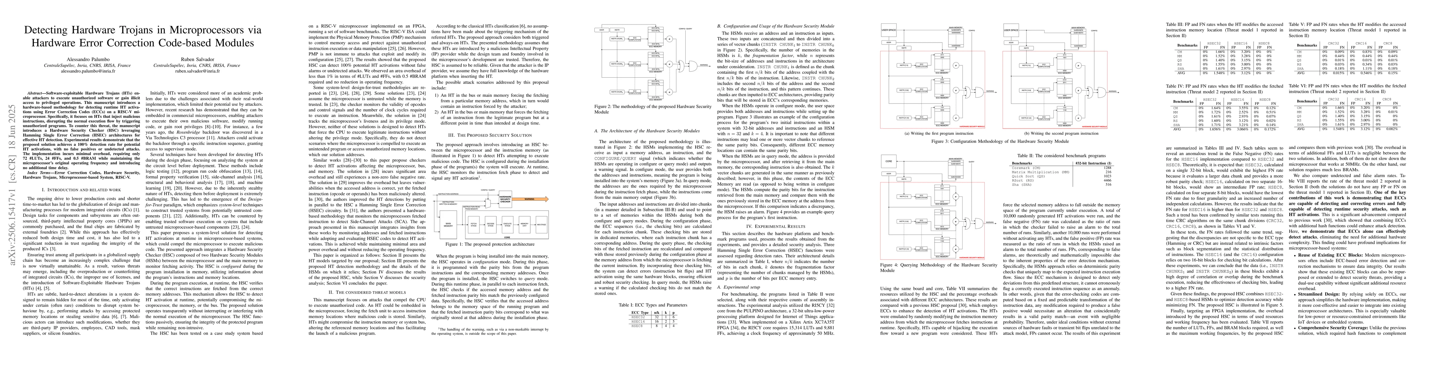 Software-exploitable Hardware Trojans (HTs) enable attackers to execute unauthorized software or gain illicit access to privileged operations. This manuscript introduces a hardware-based methodology for detecting runtime HT activations using Error Correction Codes (ECCs) on a RISC-V microprocessor. Specifically, it focuses on HTs that inject malicious instructions, disrupting the normal execution flow by triggering unauthorized programs. To counter this threat, the manuscript introduces a Hardware Security Checker (HSC) leveraging Hamming Single Error Correction (HSEC) architectures for effective HT detection. Experimental results demonstrate that the proposed solution achieves a 100% detection rate for potential HT activations, with no false positives or undetected attacks. The implementation incurs minimal overhead, requiring only 72 #LUTs, 24 #FFs, and 0.5 #BRAM while maintaining the microprocessor's original operating frequency and introducing no additional time delay.