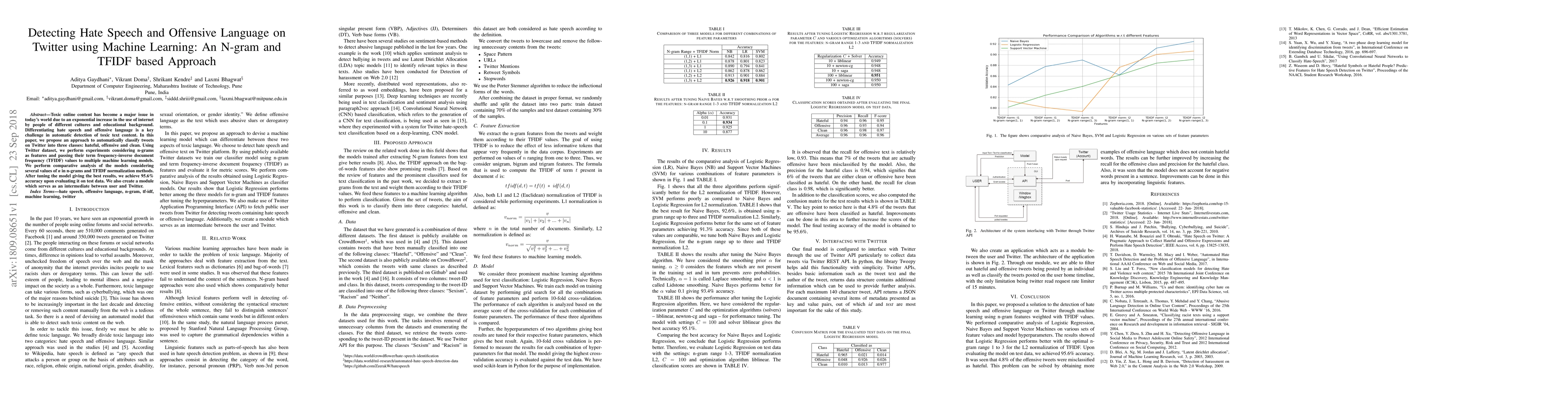Toxic online content has become a major issue in today's world due to an exponential increase in the use of internet by people of different cultures and educational background. Differentiating hate speech and offensive language is a key challenge in automatic detection of toxic text content. In this paper, we propose an approach to automatically classify tweets on Twitter into three classes: hateful, offensive and clean. Using Twitter dataset, we perform experiments considering n-grams as features and passing their term frequency-inverse document frequency (TFIDF) values to multiple machine learning models. We perform comparative analysis of the models considering several values of n in n-grams and TFIDF normalization methods. After tuning the model giving the best results, we achieve 95.6% accuracy upon evaluating it on test data. We also create a module which serves as an intermediate between user and Twitter.