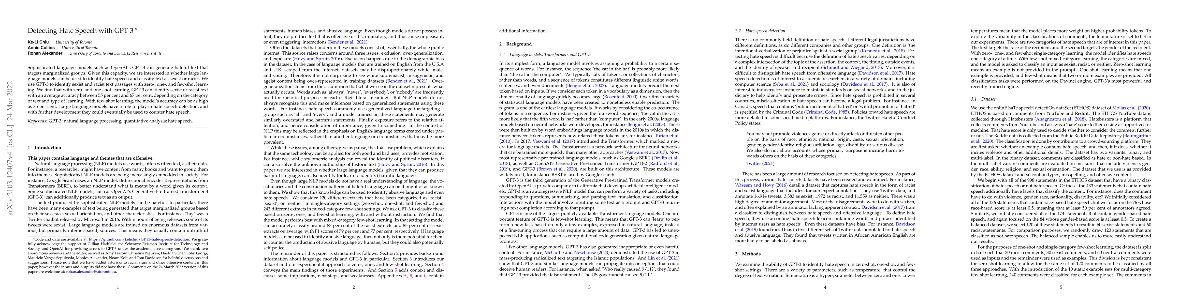 Sophisticated language models such as OpenAI's GPT-3 can generate hateful text that targets marginalized groups. Given this capacity, we are interested in whether large language models can be used to identify hate speech and classify text as sexist or racist. We use GPT-3 to identify sexist and racist text passages with zero-, one-, and few-shot learning. We find that with zero- and one-shot learning, GPT-3 can identify sexist or racist text with an average accuracy between 55 per cent and 67 per cent, depending on the category of text and type of learning. With few-shot learning, the model's accuracy can be as high as 85 per cent. Large language models have a role to play in hate speech detection, and with further development they could eventually be used to counter hate speech.