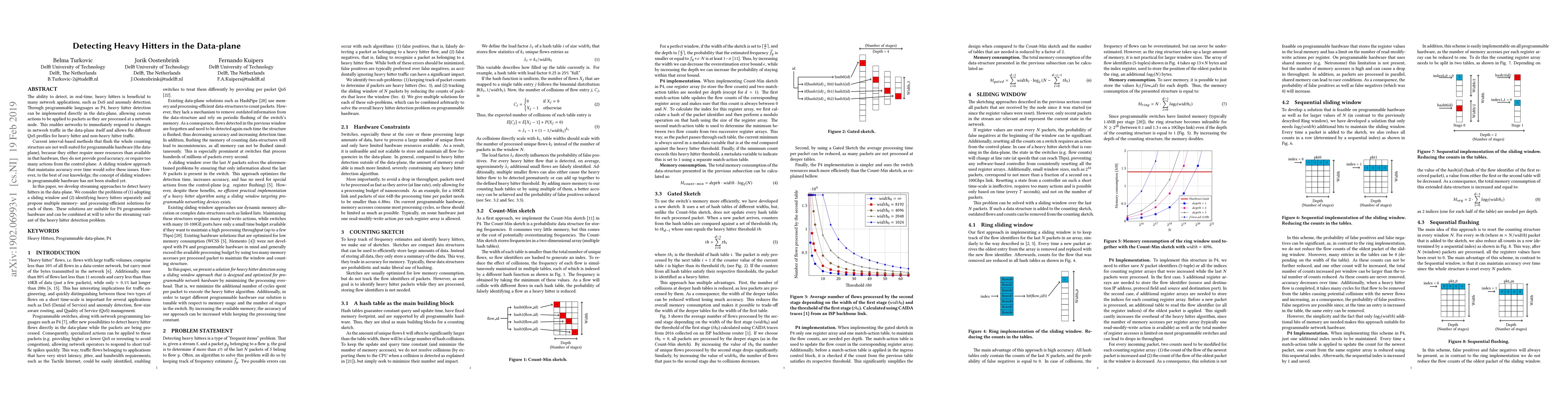 The ability to detect, in real-time, heavy hitters is beneficial to many network applications, such as DoS and anomaly detection. Through programmable languages as P4, heavy hitter detection can be implemented directly in the data-plane, allowing custom actions to be applied to packets as they are processed at a network node. This enables networks to immediately respond to changes in network traffic in the data-plane itself and allows for different QoS profiles for heavy hitter and non-heavy hitter traffic. Current interval-based methods that flush the whole counting structure are not well-suited for programmable hardware (the data-plane), because they either require more resources than available in that hardware, they do not provide good accuracy, or require too many actions from the control-plane. A sliding window approach that maintains accuracy over time would solve these issues. However, to the best of our knowledge, the concept of sliding windows in programmable hardware has not been studied yet. In this paper, we develop streaming approaches to detect heavy hitters in the data-plane. We consider the problems of (1) adopting a sliding window and (2) identifying heavy hitters separately and propose multiple memory- and processing-efficient solutions for each of them. These solutions are suitable for P4 programmable hardware and can be combined at will to solve the streaming variant of the heavy hitter detection problem.