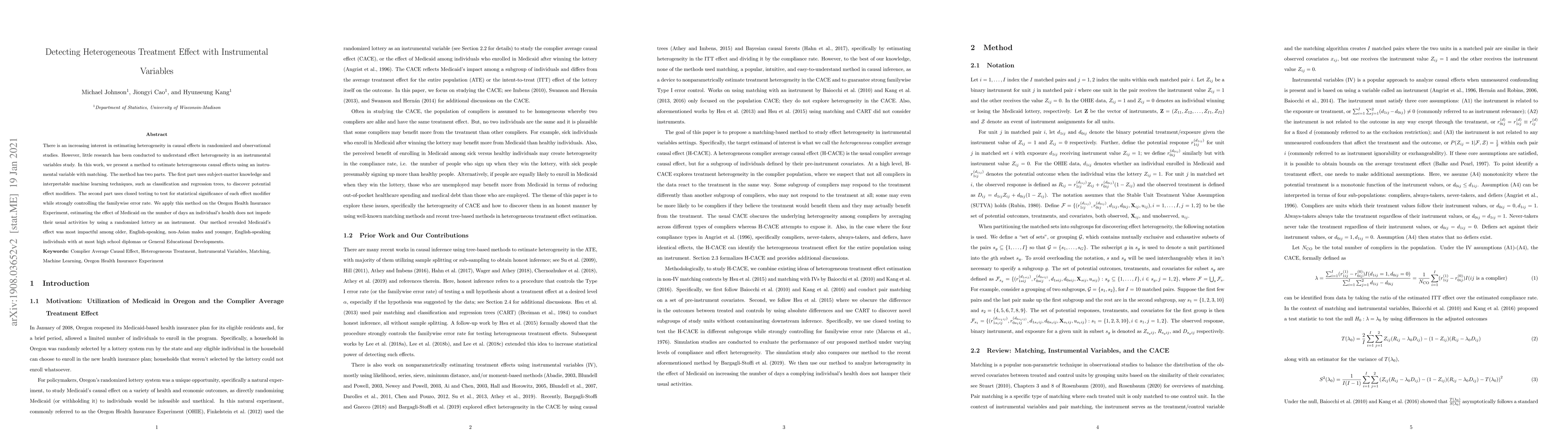 There is an increasing interest in estimating heterogeneity in causal effects in randomized and observational studies. However, little research has been conducted to understand heterogeneity in an instrumental variables study. In this work, we present a method to estimate heterogeneous causal effects using an instrumental variable approach. The method has two parts. The first part uses subject-matter knowledge and interpretable machine learning techniques, such as classification and regression trees, to discover potential effect modifiers. The second part uses closed testing to test for the statistical significance of the effect modifiers while strongly controlling familywise error rate. We conducted this method on the Oregon Health Insurance Experiment, estimating the effect of Medicaid on the number of days an individual's health does not impede their usual activities, and found evidence of heterogeneity in older men who prefer English and don't self-identify as Asian and younger individuals who have at most a high school diploma or GED and prefer English.