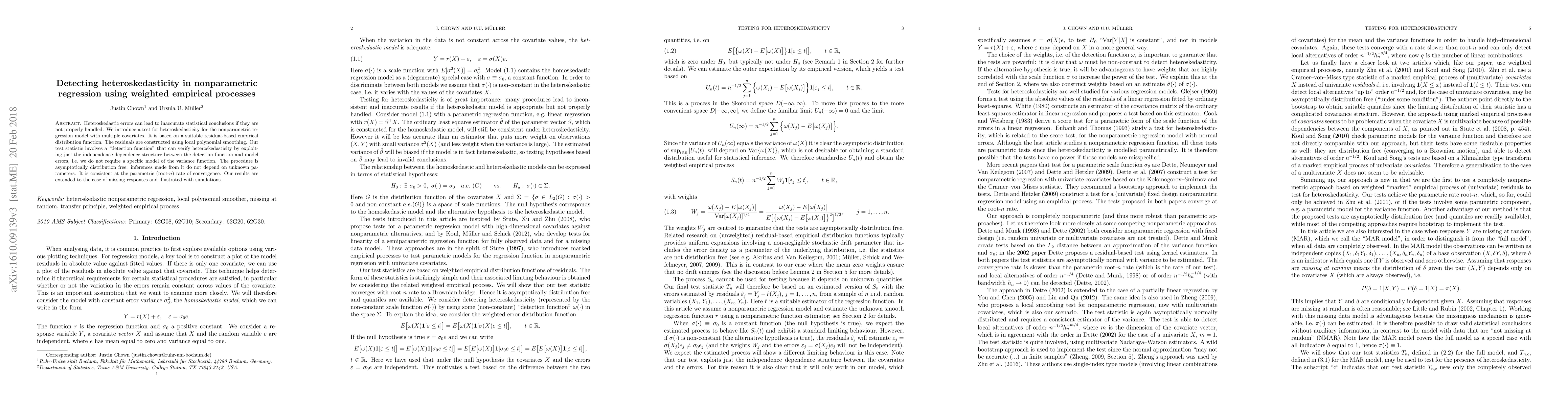 This paper proposes a novel test for detecting heteroskedasticity in nonparametric regression models using weighted empirical processes. The test leverages residuals from local polynomial smoothing and is asymptotically distribution-free, providing consistent inferences at the parametric rate.