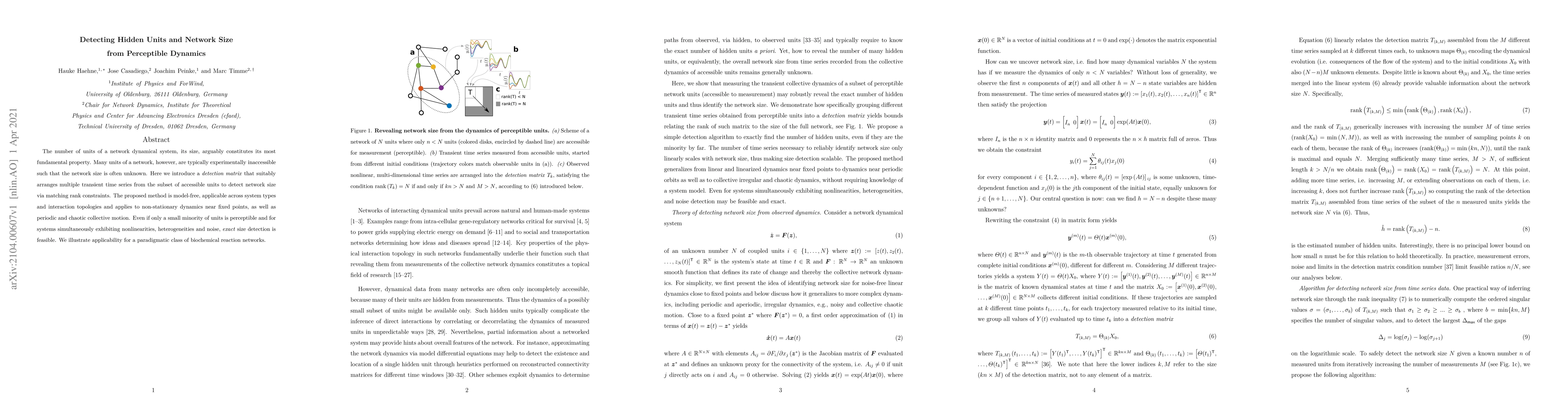 The number of units of a network dynamical system, its size, arguably constitutes its most fundamental property. Many units of a network, however, are typically experimentally inaccessible such that the network size is often unknown. Here we introduce a \emph{detection matrix }that suitably arranges multiple transient time series from the subset of accessible units to detect network size via matching rank constraints. The proposed method is model-free, applicable across system types and interaction topologies and applies to non-stationary dynamics near fixed points, as well as periodic and chaotic collective motion. Even if only a small minority of units is perceptible and for systems simultaneously exhibiting nonlinearities, heterogeneities and noise, \emph{exact} size detection is feasible. We illustrate applicability for a paradigmatic class of biochemical reaction networks.
