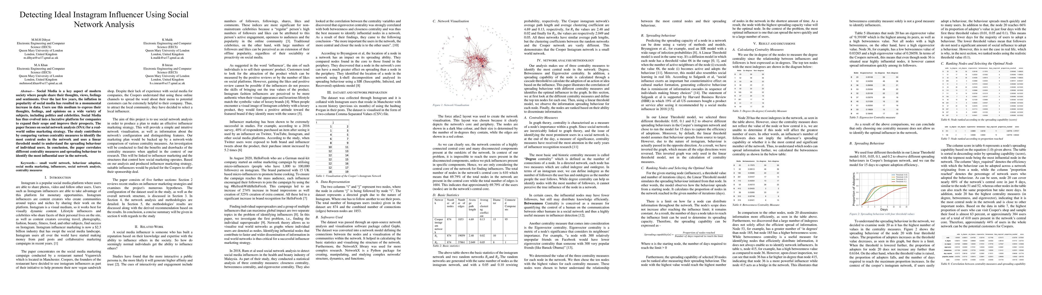 Social Media is a key aspect of modern society where people share their thoughts, views, feelings and sentiments. Over the last few years, the inflation in popularity of social media has resulted in a monumental increase in data. Users use this medium to express their thoughts, feelings, and opinions on a wide variety of subjects, including politics and celebrities. Social Media has thus evolved into a lucrative platform for companies to expand their scope and improve their prospects. The paper focuses on social network analysis (SNA) for a real-world online marketing strategy. The study contributes by comparing various centrality measures to identify the most central nodes in the network and uses a linear threshold model to understand the spreading behaviour of individual users. In conclusion, the paper correlates different centrality measures and spreading behaviour to identify the most influential user in the network