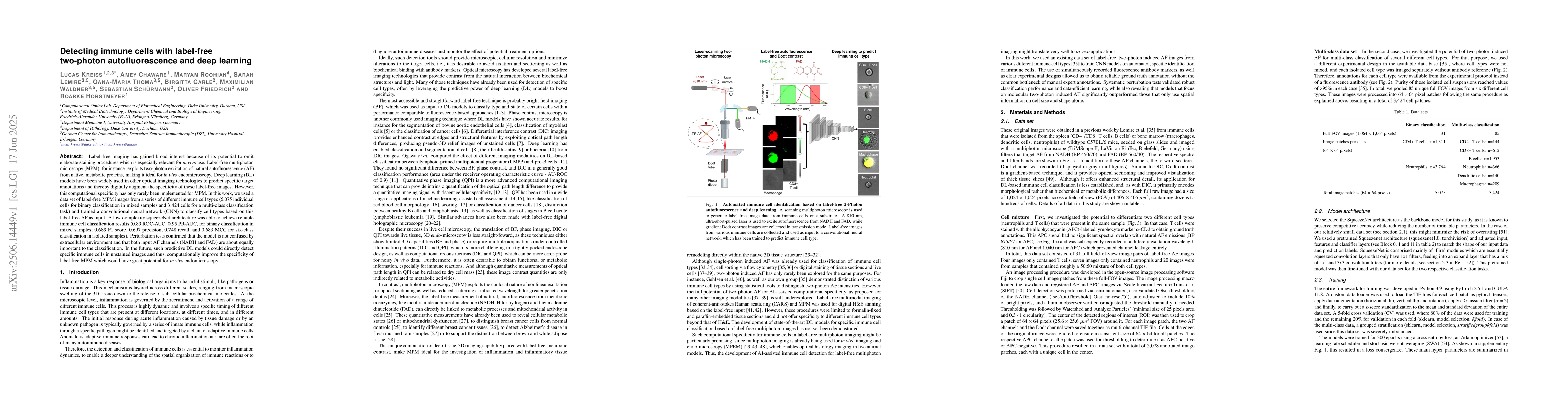 Label-free imaging has gained broad interest because of its potential to omit elaborate staining procedures which is especially relevant for in vivo use. Label-free multiphoton microscopy (MPM), for instance, exploits two-photon excitation of natural autofluorescence (AF) from native, metabolic proteins, making it ideal for in vivo endomicroscopy. Deep learning (DL) models have been widely used in other optical imaging technologies to predict specific target annotations and thereby digitally augment the specificity of these label-free images. However, this computational specificity has only rarely been implemented for MPM. In this work, we used a data set of label-free MPM images from a series of different immune cell types (5,075 individual cells for binary classification in mixed samples and 3,424 cells for a multi-class classification task) and trained a convolutional neural network (CNN) to classify cell types based on this label-free AF as input. A low-complexity squeezeNet architecture was able to achieve reliable immune cell classification results (0.89 ROC-AUC, 0.95 PR-AUC, for binary classification in mixed samples; 0.689 F1 score, 0.697 precision, 0.748 recall, and 0.683 MCC for six-class classification in isolated samples). Perturbation tests confirmed that the model is not confused by extracellular environment and that both input AF channels (NADH and FAD) are about equally important to the classification. In the future, such predictive DL models could directly detect specific immune cells in unstained images and thus, computationally improve the specificity of label-free MPM which would have great potential for in vivo endomicroscopy.