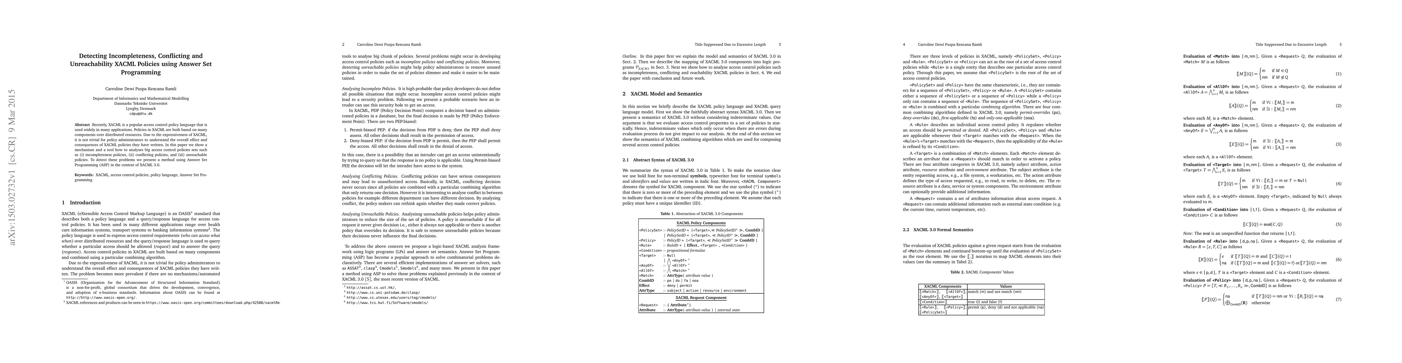 This paper proposes a mechanism and tool for analyzing large sets of XACML access control policies to detect incompleteness, conflicts, and unreachable policies. It utilizes Answer Set Programming (ASP) to address the complexities of XACML policies across distributed resources.