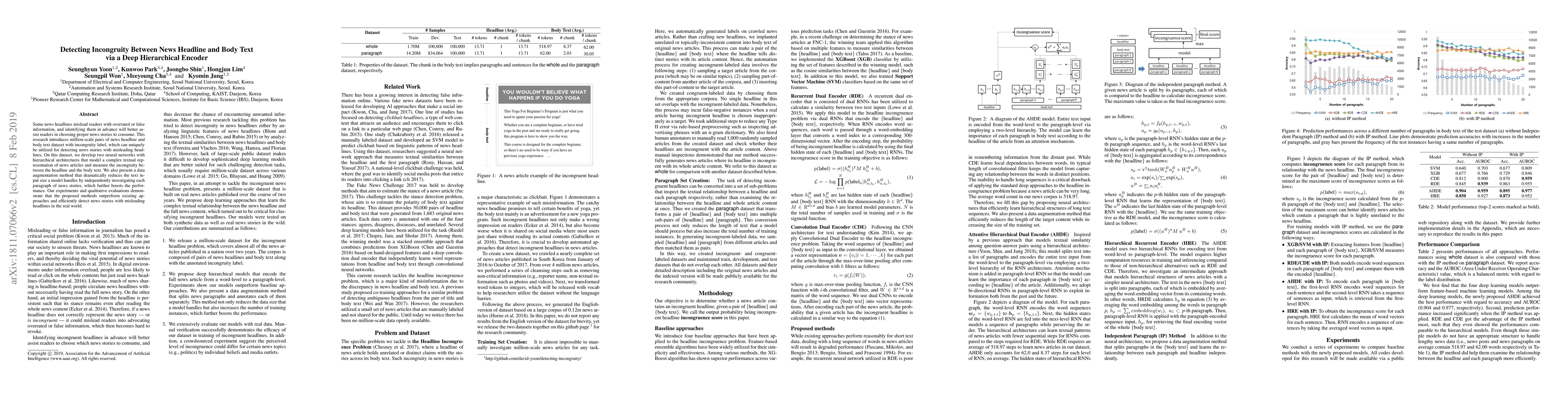 This paper develops a deep hierarchical encoder to detect incongruity between news headlines and body texts, using a large dataset labeled for incongruity. The proposed neural networks outperform existing methods, aided by a data augmentation technique that analyzes paragraphs independently, effectively reducing input size and improving performance.
