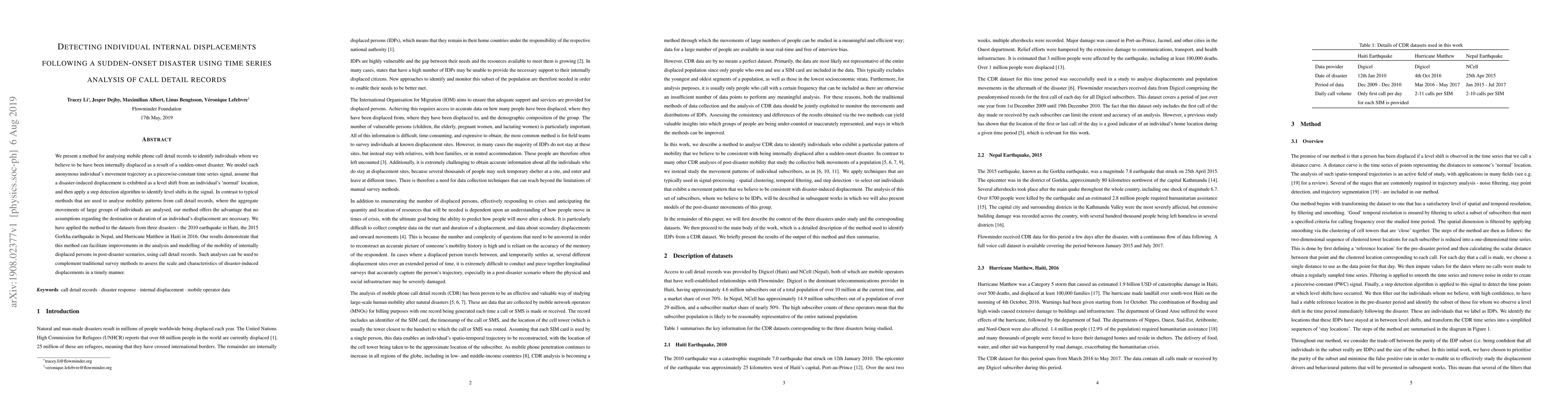 This paper proposes a method to detect individual internal displacements post-disaster using time series analysis of mobile phone call detail records, identifying level shifts in movement patterns as indicators of displacement. The method was tested on datasets from three disasters, demonstrating its potential to complement traditional surveys in assessing displacement.