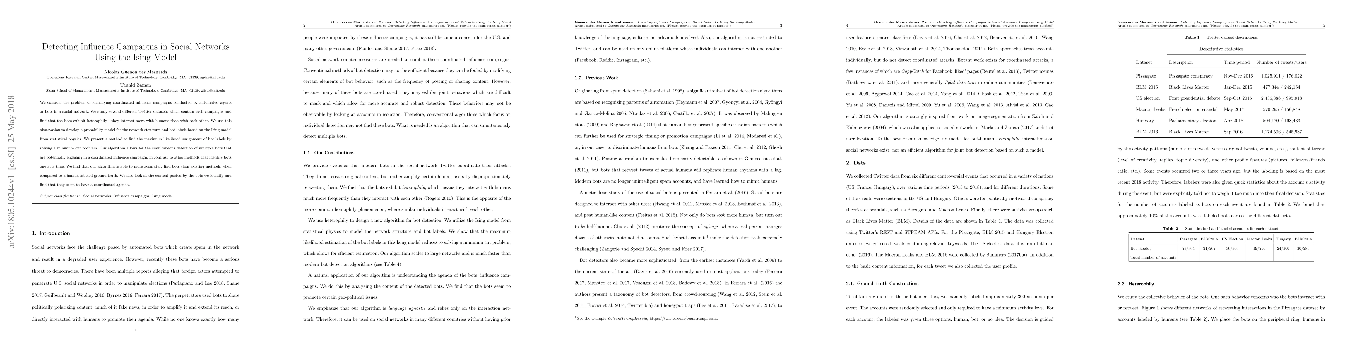 This research introduces a method using the Ising model to detect coordinated influence campaigns by bots in social networks, finding that bots show heterophily and exhibit coordinated agendas. The proposed algorithm outperforms existing methods in identifying multiple bots simultaneously.