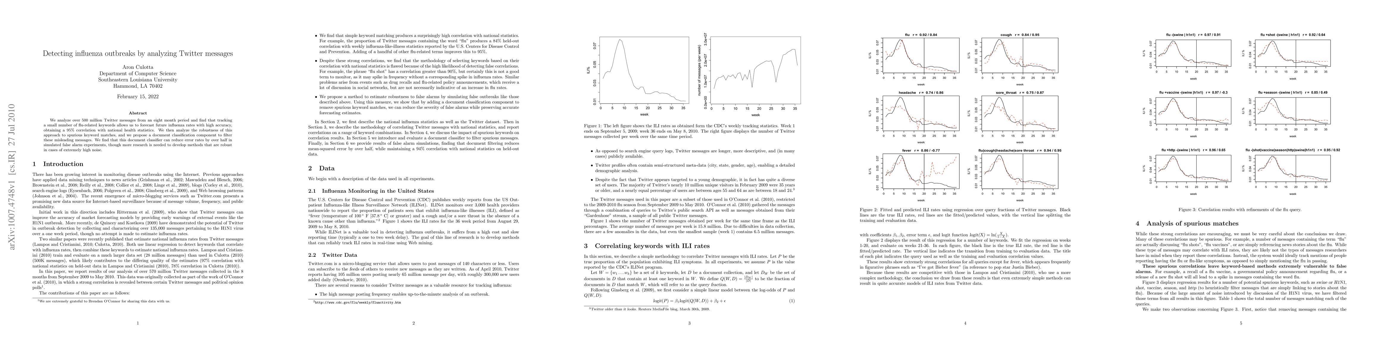 Researchers analyzed 500 million Twitter messages to forecast influenza outbreaks with high accuracy using flu-related keywords, achieving a 95% correlation with national health statistics. A proposed document classifier reduced error rates by over half in simulated false alarm experiments.
