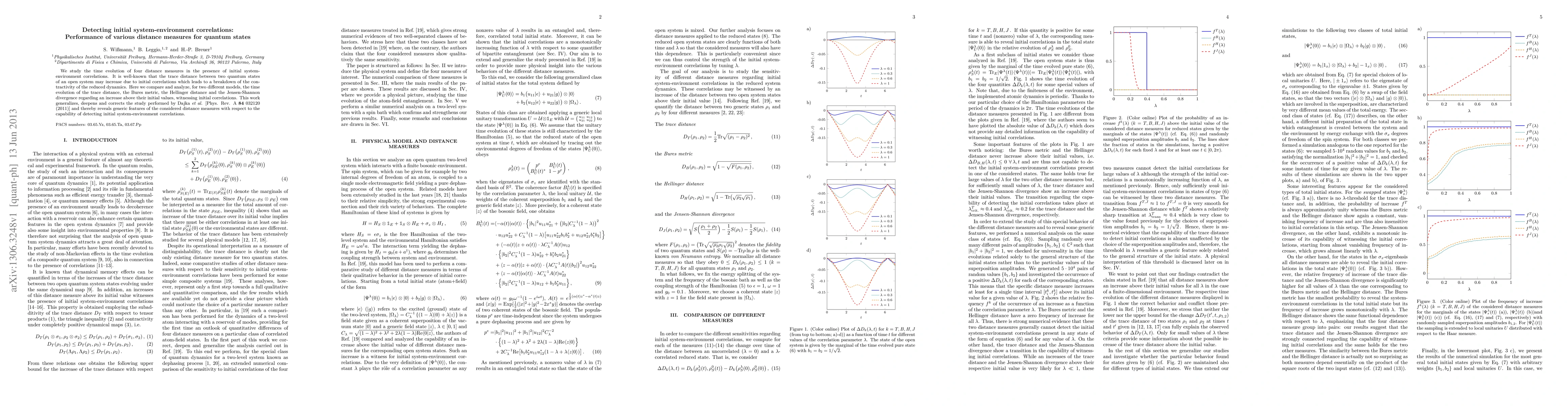 This paper investigates the time evolution of four distance measures—trace distance, Bures metric, Hellinger distance, and Jensen-Shannon divergence—to detect initial correlations in quantum systems. It compares their performance in two models, revealing generic features of these measures in detecting such correlations and correcting previous studies.