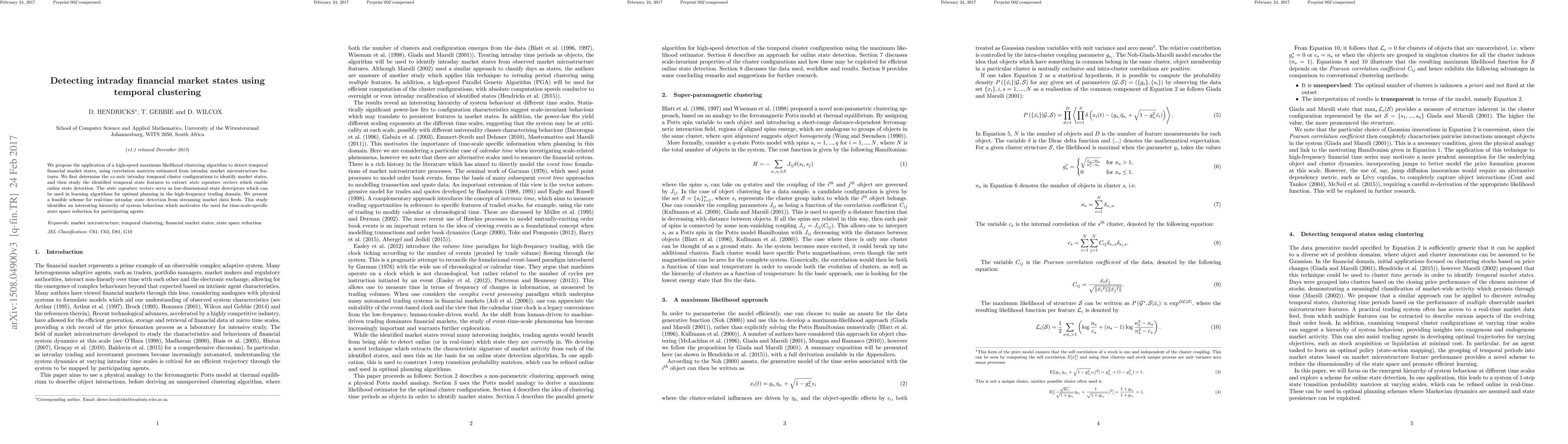 We propose the application of a high-speed maximum likelihood clustering algorithm to detect temporal financial market states, using correlation matrices estimated from intraday market microstructure features. We first determine the ex-ante intraday temporal cluster configurations to identify market states, and then study the identified temporal state features to extract state signature vectors which enable online state detection. The state signature vectors serve as low-dimensional state descriptors which can be used in learning algorithms for optimal planning in the high-frequency trading domain. We present a feasible scheme for real-time intraday state detection from streaming market data feeds. This study identifies an interesting hierarchy of system behaviour which motivates the need for time-scale-specific state space reduction for participating agents.