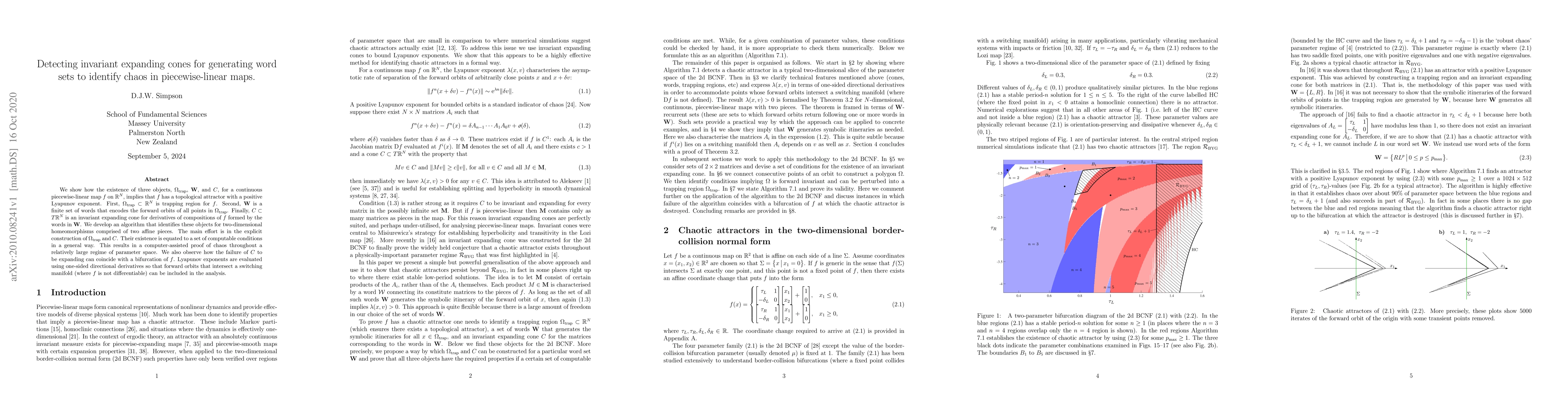 We show how the existence of three objects, $\Omega_{\rm trap}$, ${\bf W}$, and $C$, for a continuous piecewise-linear map $f$ on $\mathbb{R}^N$, implies that $f$ has a topological attractor with a positive Lyapunov exponent. First, $\Omega_{\rm trap} \subset \mathbb{R}^N$ is trapping region for $f$. Second, ${\bf W}$ is a finite set of words that encodes the forward orbits of all points in $\Omega_{\rm trap}$. Finally, $C \subset T \mathbb{R}^N$ is an invariant expanding cone for derivatives of compositions of $f$ formed by the words in ${\bf W}$. We develop an algorithm that identifies these objects for two-dimensional homeomorphisms comprised of two affine pieces. The main effort is in the explicit construction of $\Omega_{\rm trap}$ and $C$. Their existence is equated to a set of computable conditions in a general way. This results in a computer-assisted proof of chaos throughout a relatively large regime of parameter space. We also observe how the failure of $C$ to be expanding can coincide with a bifurcation of $f$. Lyapunov exponents are evaluated using one-sided directional derivatives so that forward orbits that intersect a switching manifold (where $f$ is not differentiable) can be included in the analysis.