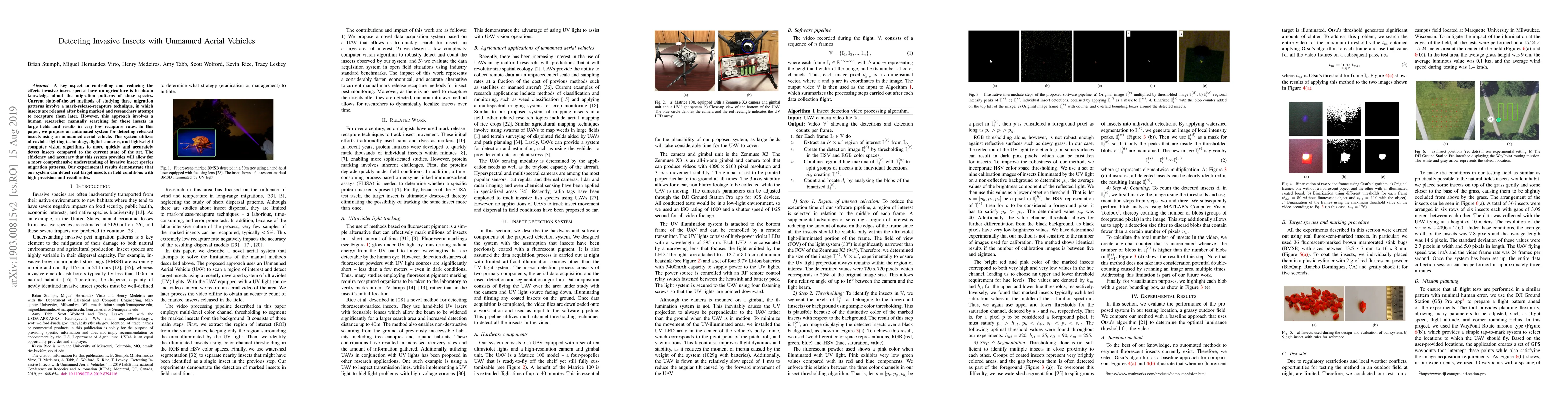 A key aspect to controlling and reducing the effects invasive insect species have on agriculture is to obtain knowledge about the migration patterns of these species. Current state-of-the-art methods of studying these migration patterns involve a mark-release-recapture technique, in which insects are released after being marked and researchers attempt to recapture them later. However, this approach involves a human researcher manually searching for these insects in large fields and results in very low recapture rates. In this paper, we propose an automated system for detecting released insects using an unmanned aerial vehicle. This system utilizes ultraviolet lighting technology, digital cameras, and lightweight computer vision algorithms to more quickly and accurately detect insects compared to the current state of the art. The efficiency and accuracy that this system provides will allow for a more comprehensive understanding of invasive insect species migration patterns. Our experimental results demonstrate that our system can detect real target insects in field conditions with high precision and recall rates.