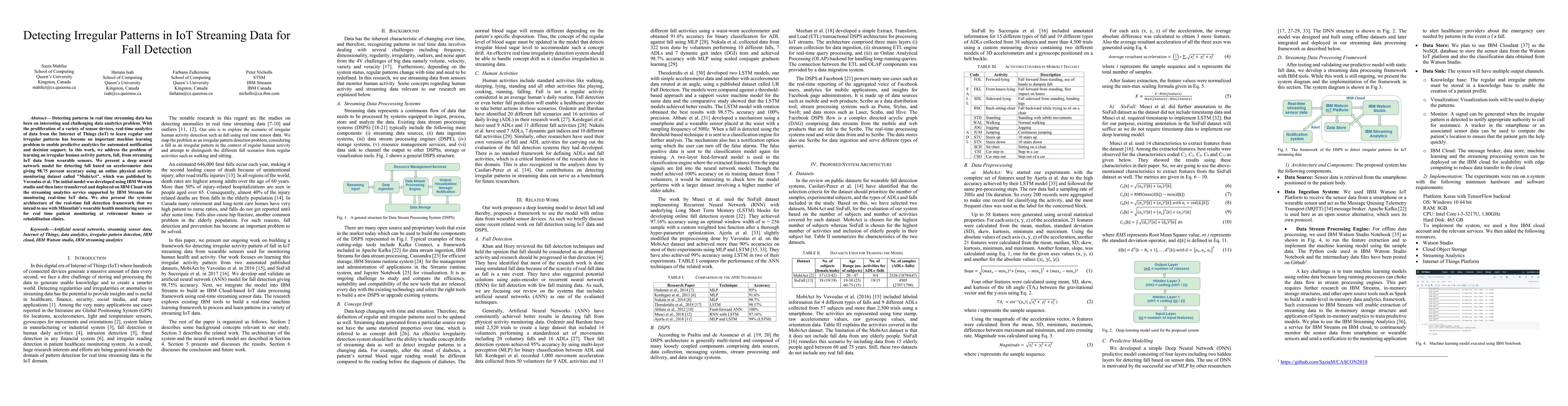 This paper proposes a deep neural network model to detect falls from irregular patterns in real-time IoT streaming data using accelerometer data, achieving 98.75% accuracy. The model, developed in IBM Watson studio and deployed on IBM Cloud with IBM Streams, is intended for real-time patient monitoring in retirement homes or rehabilitation clinics.