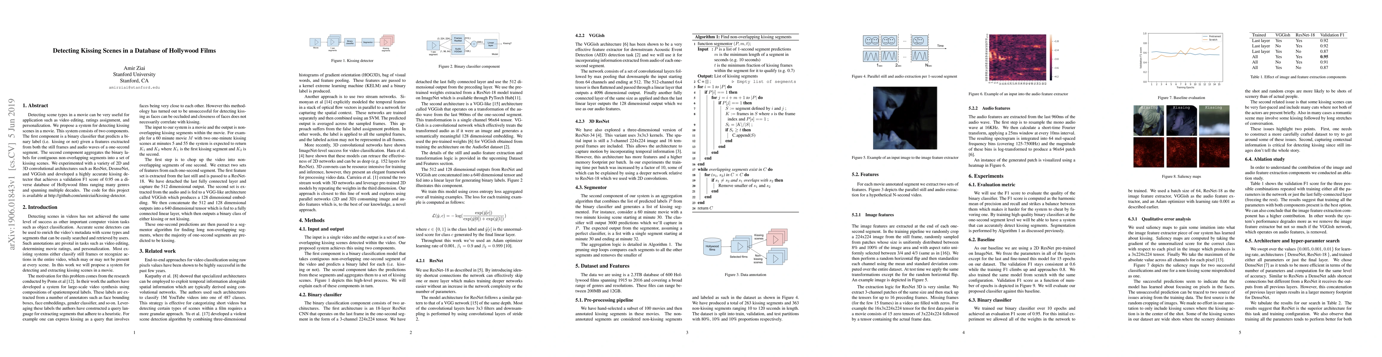Detecting scene types in a movie can be very useful for application such as video editing, ratings assignment, and personalization. We propose a system for detecting kissing scenes in a movie. This system consists of two components. The first component is a binary classifier that predicts a binary label (i.e. kissing or not) given a features exctracted from both the still frames and audio waves of a one-second segment. The second component aggregates the binary labels for contiguous non-overlapping segments into a set of kissing scenes. We experimented with a variety of 2D and 3D convolutional architectures such as ResNet, DesnseNet, and VGGish and developed a highly accurate kissing detector that achieves a validation F1 score of 0.95 on a diverse database of Hollywood films ranging many genres and spanning multiple decades. The code for this project is available at http://github.com/amirziai/kissing-detector.
