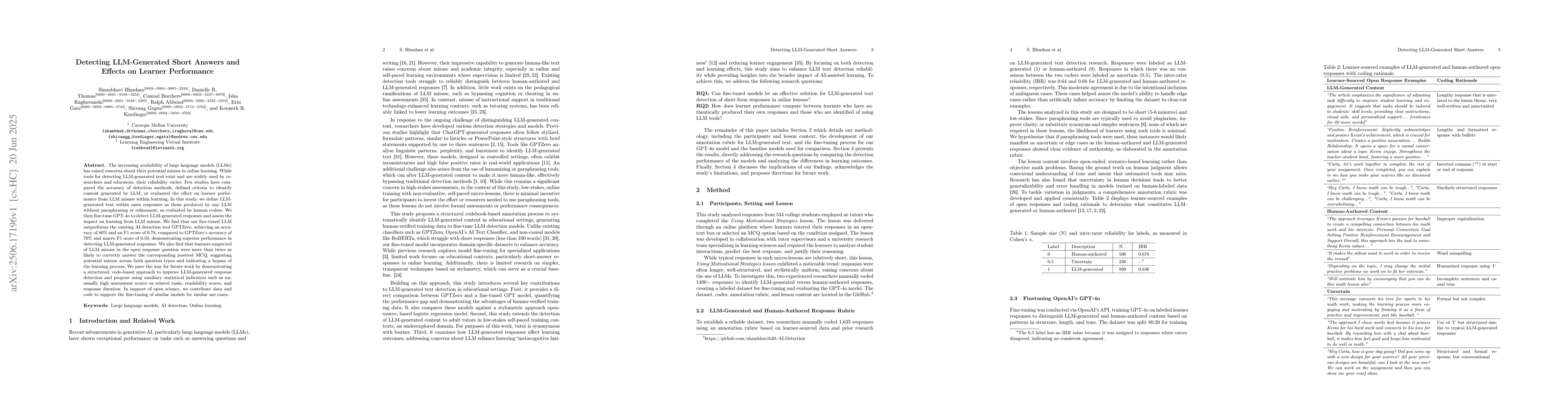 The increasing availability of large language models (LLMs) has raised concerns about their potential misuse in online learning. While tools for detecting LLM-generated text exist and are widely used by researchers and educators, their reliability varies. Few studies have compared the accuracy of detection methods, defined criteria to identify content generated by LLM, or evaluated the effect on learner performance from LLM misuse within learning. In this study, we define LLM-generated text within open responses as those produced by any LLM without paraphrasing or refinement, as evaluated by human coders. We then fine-tune GPT-4o to detect LLM-generated responses and assess the impact on learning from LLM misuse. We find that our fine-tuned LLM outperforms the existing AI detection tool GPTZero, achieving an accuracy of 80% and an F1 score of 0.78, compared to GPTZero's accuracy of 70% and macro F1 score of 0.50, demonstrating superior performance in detecting LLM-generated responses. We also find that learners suspected of LLM misuse in the open response question were more than twice as likely to correctly answer the corresponding posttest MCQ, suggesting potential misuse across both question types and indicating a bypass of the learning process. We pave the way for future work by demonstrating a structured, code-based approach to improve LLM-generated response detection and propose using auxiliary statistical indicators such as unusually high assessment scores on related tasks, readability scores, and response duration. In support of open science, we contribute data and code to support the fine-tuning of similar models for similar use cases.