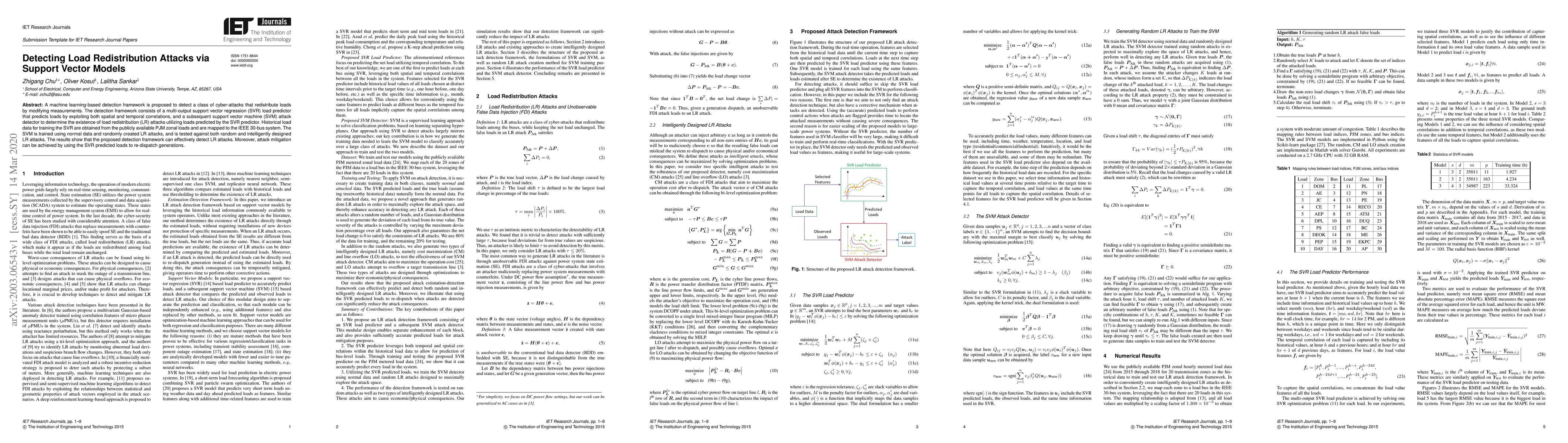 A machine learning-based framework detects load redistribution attacks by predicting loads with SVR and detecting anomalies with SVM, achieving effective detection and attack mitigation.