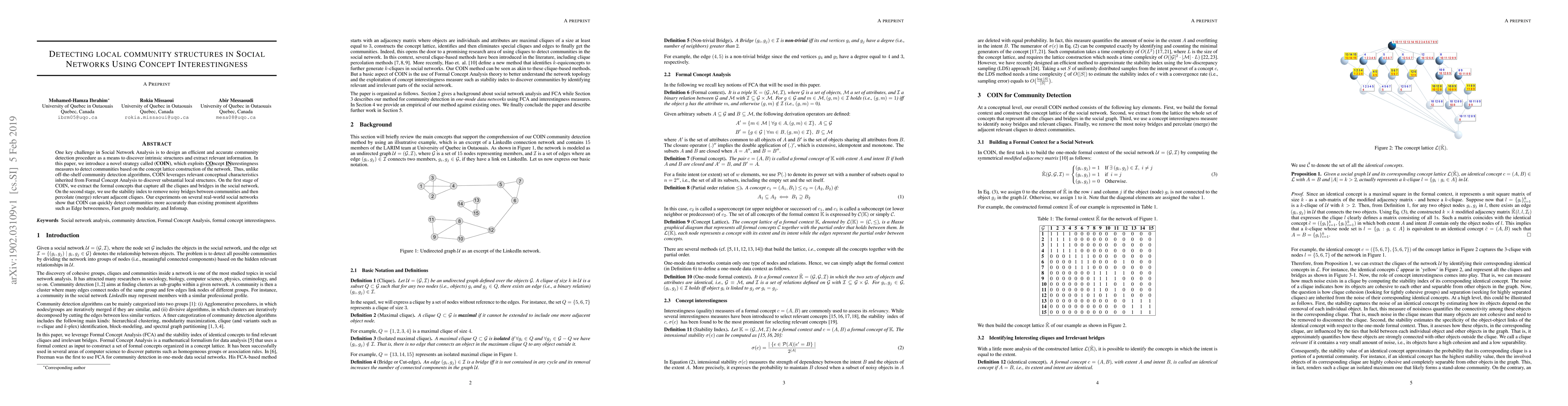 This paper introduces COIN, a novel community detection strategy leveraging concept interestingness measures from Formal Concept Analysis to identify local structures in social networks. COIN outperforms existing algorithms like Edge Betweenness and Fast Greedy Modularity on real-world datasets by detecting communities more accurately.