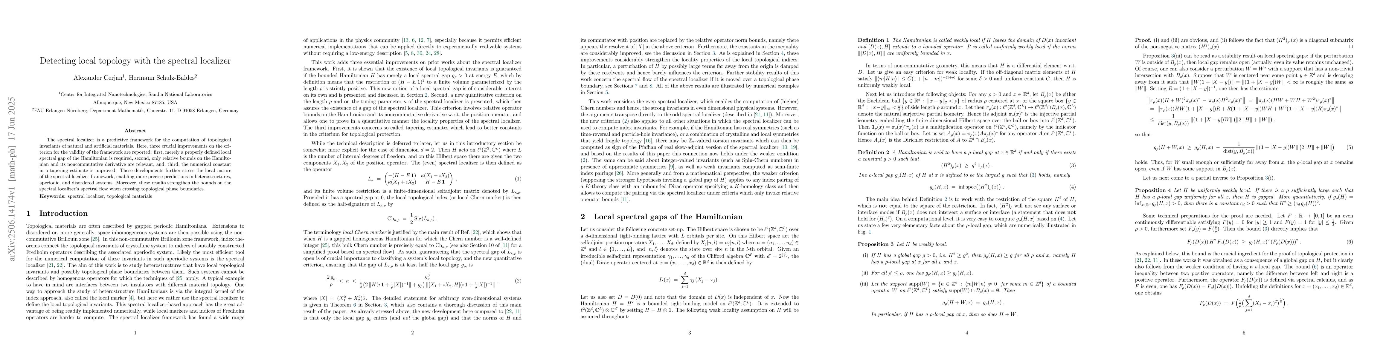 The spectral localizer is a predictive framework for the computation of topological invariants of natural and artificial materials. Here, three crucial improvements on the criterion for the validity of the framework are reported: first, merely a properly defined local spectral gap of the Hamiltonian is required, second, only relative bounds on the Hamiltonian and its noncommutative derivative are relevant, and, third, the numerical constant in a tapering estimate is improved. These developments further stress the local nature of the spectral localizer framework, enabling more precise predictions in heterostructures, aperiodic, and disordered systems. Moreover, these results strengthen the bounds on the spectral localizer's spectral flow when crossing topological phase boundaries.