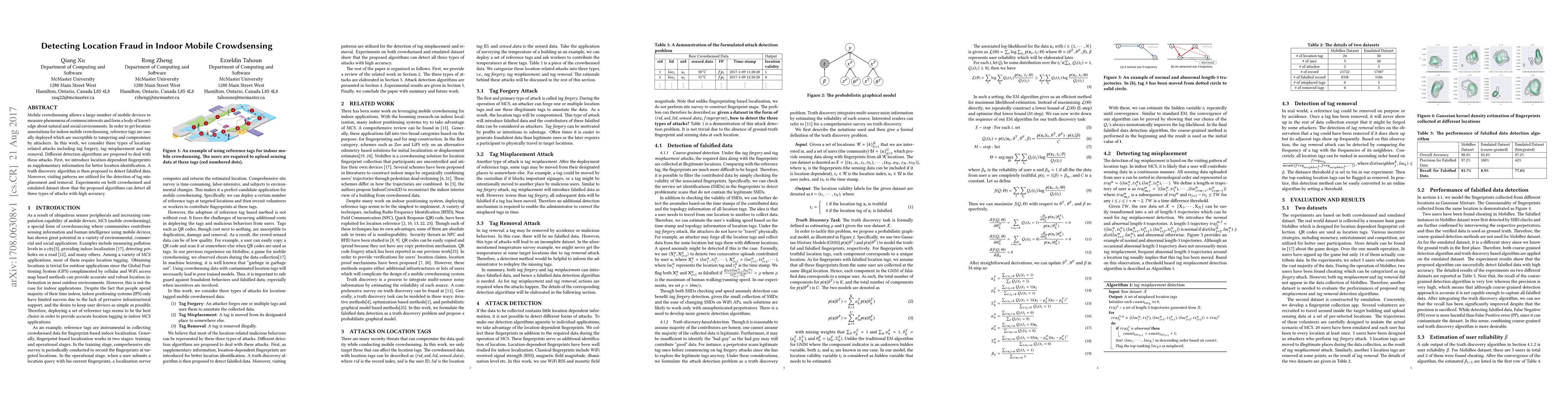 This paper proposes detection algorithms to identify location fraud in indoor mobile crowdsensing, addressing tag forgery, misplacement, and removal. It utilizes location-dependent fingerprints and truth discovery algorithms, along with visiting patterns, to achieve high accuracy in detecting these attacks.