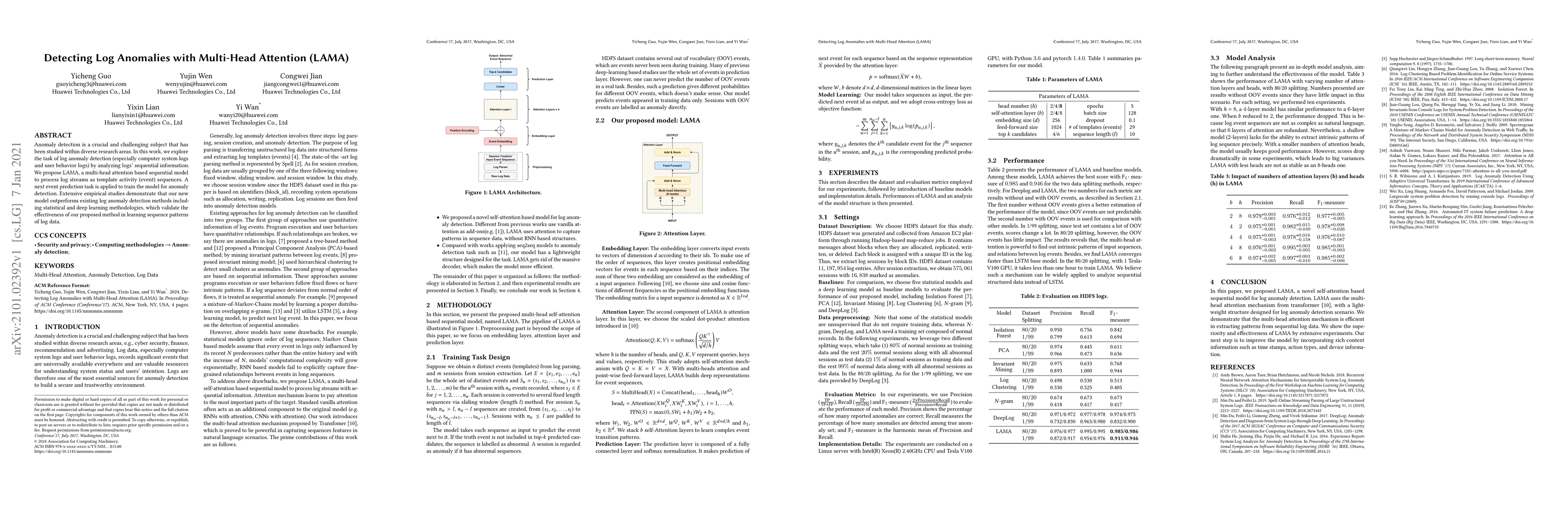 Anomaly detection is a crucial and challenging subject that has been studied within diverse research areas. In this work, we explore the task of log anomaly detection (especially computer system logs and user behavior logs) by analyzing logs' sequential information. We propose LAMA, a multi-head attention based sequential model to process log streams as template activity (event) sequences. A next event prediction task is applied to train the model for anomaly detection. Extensive empirical studies demonstrate that our new model outperforms existing log anomaly detection methods including statistical and deep learning methodologies, which validate the effectiveness of our proposed method in learning sequence patterns of log data.