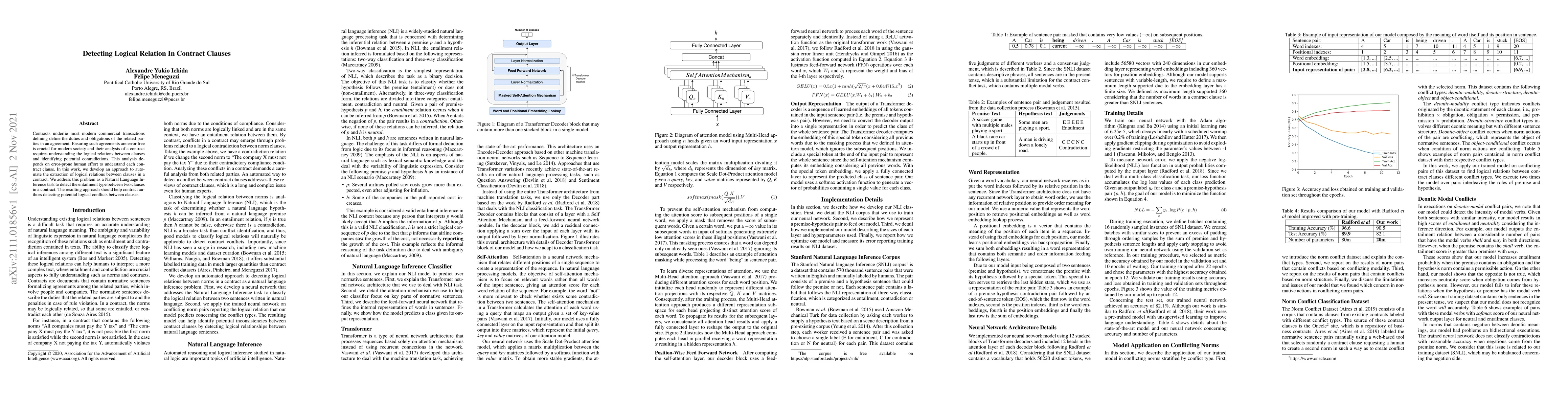 The paper presents a novel application of Transformer-based NLI models for detecting logical relations in contract clauses, specifically using Multi-Head attention for improved performance.