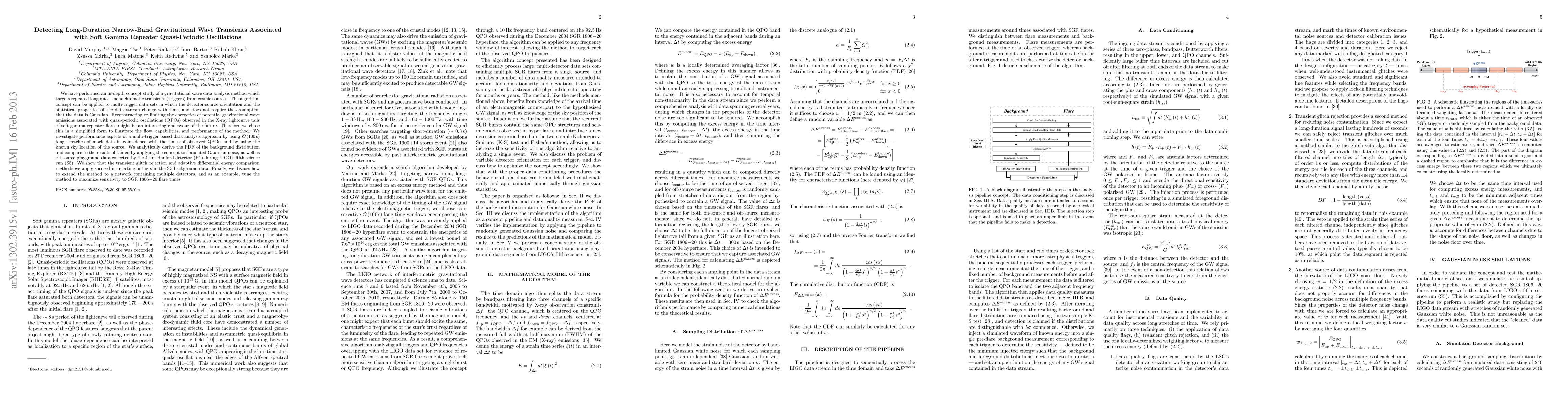 We have performed an in-depth concept study of a gravitational wave data analysis method which targets repeated long quasi-monochromatic transients (triggers) from cosmic sources. The algorithm concept can be applied to multi-trigger data sets in which the detector-source orientation and the statistical properties of the data stream change with time, and does not require the assumption that the data is Gaussian. Reconstructing or limiting the energetics of potential gravitational wave emissions associated with quasi-periodic oscillations (QPOs) observed in the X-ray lightcurve tails of soft gamma repeater flares might be an interesting endeavour of the future. Therefore we chose this in a simplified form to illustrate the flow, capabilities, and performance of the method. We investigate performance aspects of a multi-trigger based data analysis approach by using O(100 s) long stretches of mock data in coincidence with the times of observed QPOs, and by using the known sky location of the source. We analytically derive the PDF of the background distribution and compare to the results obtained by applying the concept to simulated Gaussian noise, as well as off-source playground data collected by the 4-km Hanford detector (H1) during LIGO's fifth science run (S5). We show that the transient glitch rejection and adaptive differential energy comparison methods we apply succeed in rejecting outliers in the S5 background data. Finally, we discuss how to extend the method to a network containing multiple detectors, and as an example, tune the method to maximize sensitivity to SGR 1806-20 flare times.