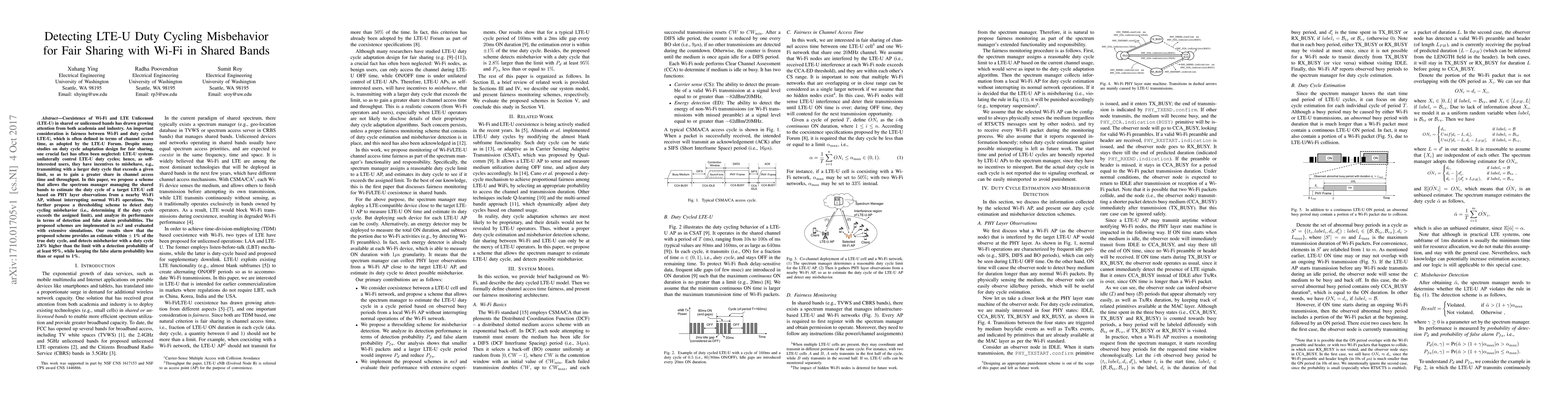 Coexistence of Wi-Fi and LTE Unlicensed (LTE-U) in shared or unlicensed bands has drawn growing attention from both academia and industry. An important consideration is fairness between Wi-Fi and duty cycled LTE-U, which is often defined in terms of channel access time, as adopted by the LTE-U Forum. Despite many studies on duty cycle adaptation design for fair sharing, one crucial fact has often been neglected: LTE-U systems unilaterally control LTE-U duty cycles; hence, as self- interested users, they have incentives to misbehave, e.g., transmitting with a larger duty cycle that exceeds a given limit, so as to gain a greater share in channel access time and throughput. In this paper, we propose a scheme that allows the spectrum manager managing the shared bands to estimate the duty cycle of a target LTE-U cell based on PHY layer observations from a nearby Wi-Fi AP, without interrupting normal Wi-Fi operations. We further propose a thresholding scheme to detect duty cycling misbehavior (i.e., determining if the duty cycle exceeds the assigned limit), and analyze its performance in terms of detection and false alarm probabilities. The proposed schemes are implemented in ns3 and evaluated with extensive simulations. Our results show that the proposed scheme provides an estimate within +/- 1% of the true duty cycle, and detects misbehavior with a duty cycle 2.8% higher than the limit with a detection probability of at least 95%, while keeping the false alarm probability less than or equal to 1%.