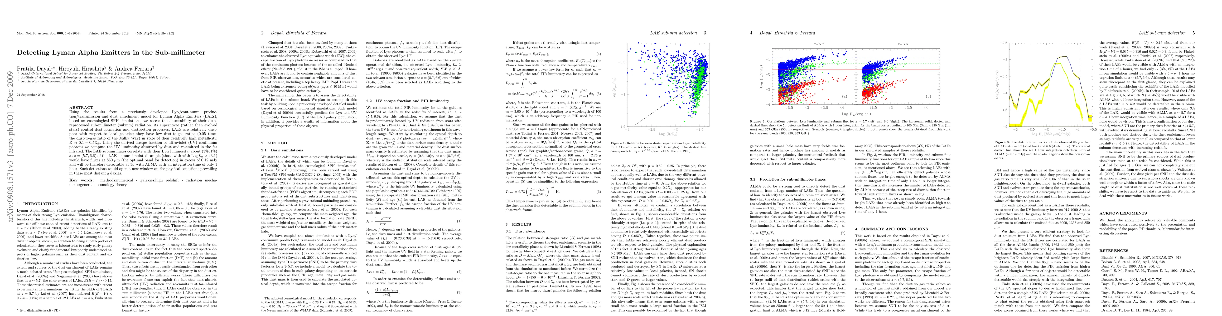 Using the results from a previously developed Lyman Alpha/continuum production/transmission and dust enrichment model for Lyman Alpha Emitters (LAEs), based on cosmological SPH simulations, we assess the detectability of their dust-reprocessed sub-millimeter (submm) radiation. As supernovae (rather than evolved stars) control dust formation and destruction processes, LAEs are relatively dust-poor with respect to local galaxies: they have low dust-to-gas ratios (0.05 times the dust-to-gas ratio of the Milky Way) in spite of their relatively high metallicity, which is approximately 10-50% of the solar value. Using the derived escape fraction of ultraviolet (UV) continuum photons we compute the UV luminosity absorbed by dust and re-emitted in the far infrared. The LAE submm fluxes correlate with their Lyman Alpha luminosity: about (3%, 1%) at z=(5.7, 6.6) of the LAEs in our simulated sample (those with with Log L_\alpha > 43.1) would have fluxes at 850 micrometer (the optimal band for detection) in excess of 0.12 mJy and will be therefore detectable at 5 sigma with ALMA with an integration time of only 1 hour. Such detections would open a new window on the physical conditions prevailing in these most distant galaxies.