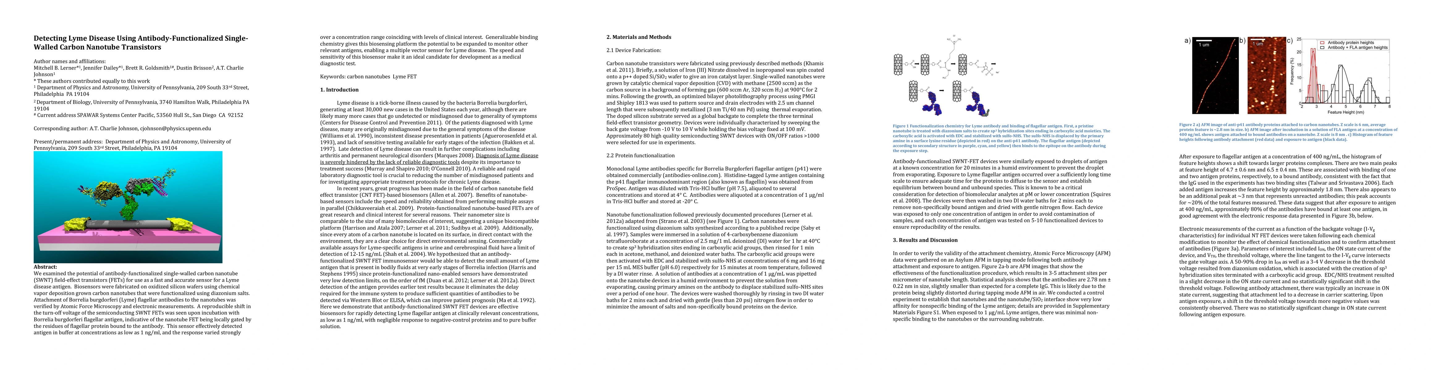 This study presents a highly sensitive biosensor using antibody-functionalized single-walled carbon nanotube transistors for detecting Lyme disease antigens, achieving detection at concentrations as low as 1 ng/ml, with potential for expansion to monitor other antigens. The sensor's rapid response and accuracy make it a promising tool for medical diagnostics.