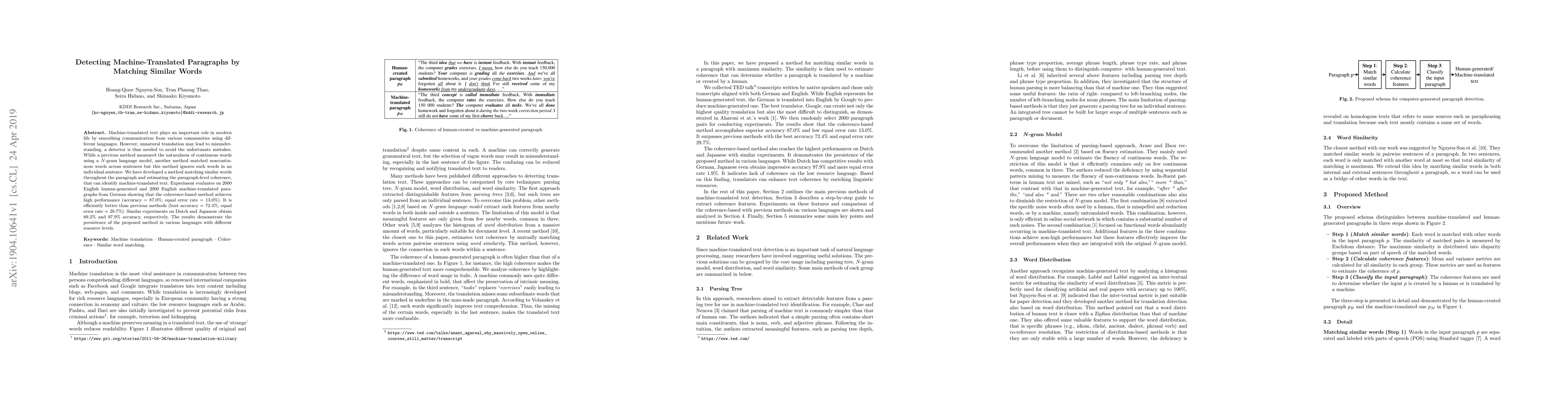 This paper proposes a method to detect machine-translated paragraphs by matching similar words across the entire paragraph, achieving high accuracy (87%) in identifying English translations from German. The method outperforms previous techniques and shows strong performance across different languages.