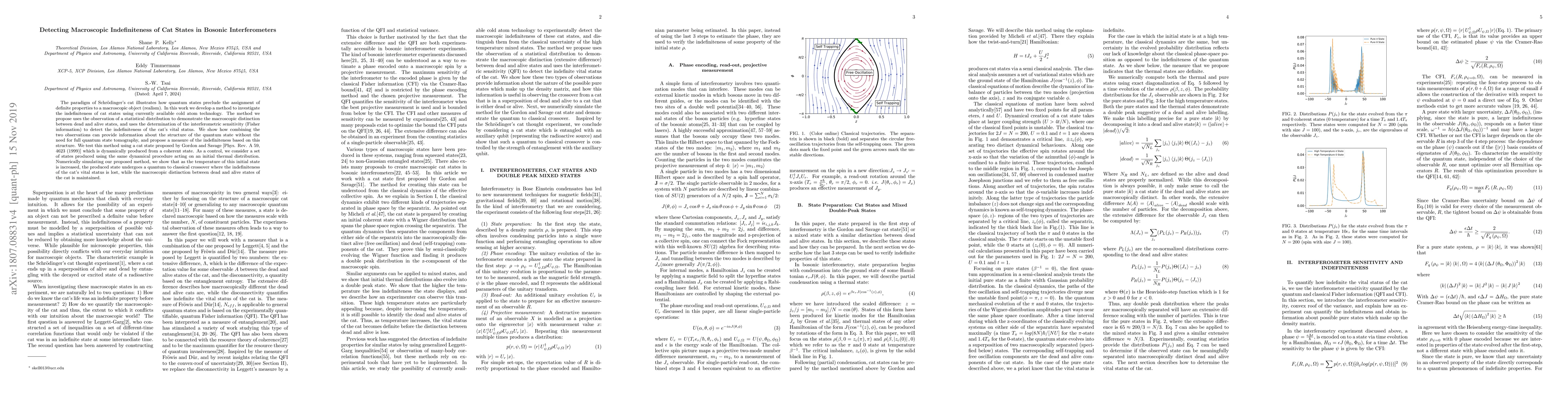 The paradigm of Schr\"{o}dinger's cat illustrates how quantum states preclude the assignment of definite properties to a macroscopic object (realism). In this work we develop a method to investigate the indefiniteness of cat states using currently available cold atom technology. The method we propose uses the observation of a statistical distribution to demonstrate the macroscopic distinction between dead and alive states, and uses the determination of the interferometric sensitivity (Fisher information) to detect the indefiniteness of the cat's vital status. We show how combining the two observations can provide information about the structure of the quantum state without the need for full quantum state tomography, and propose a measure of the indefiniteness based on this structure. We test this method using a cat state proposed by Gordon and Savage [Phys. Rev. A 59, 4623 (1999)] which is dynamically produced from a coherent state. As a control, we consider a set of states produced using the same dynamical procedure acting on an initial thermal distribution. Numerically simulating our proposed method, we show that as the temperature of this initial state is increased, the produced state undergoes a quantum to classical crossover where the indefiniteness of the cat's vital status is lost, while the macroscopic distinction between dead and alive states of the cat is maintained.