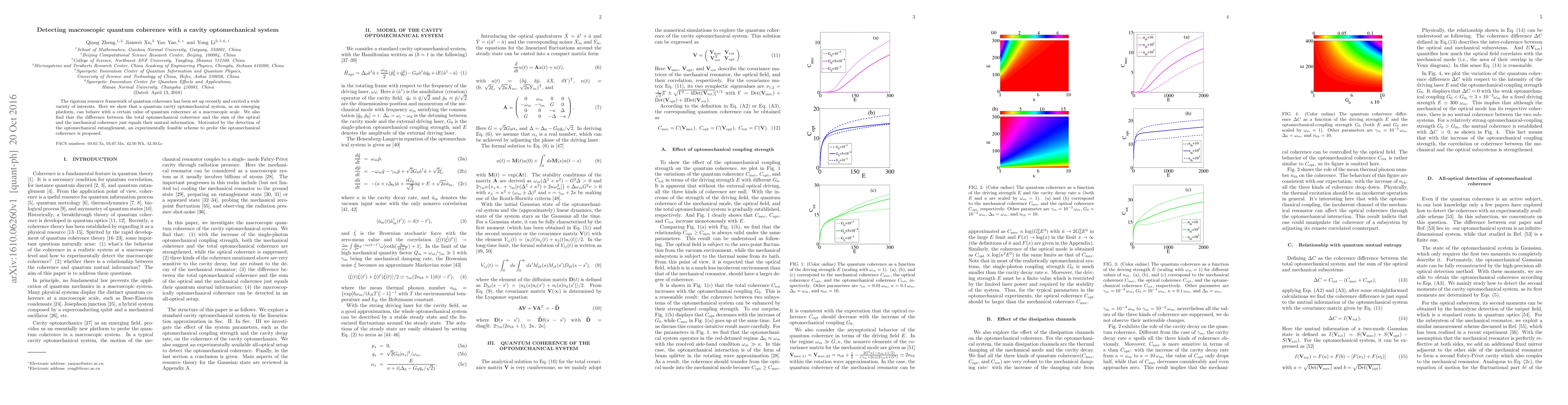 This paper demonstrates that a quantum cavity optomechanical system can exhibit macroscopic quantum coherence and proposes an experimental method to detect this coherence, showing a relationship between total optomechanical coherence and mutual information.
